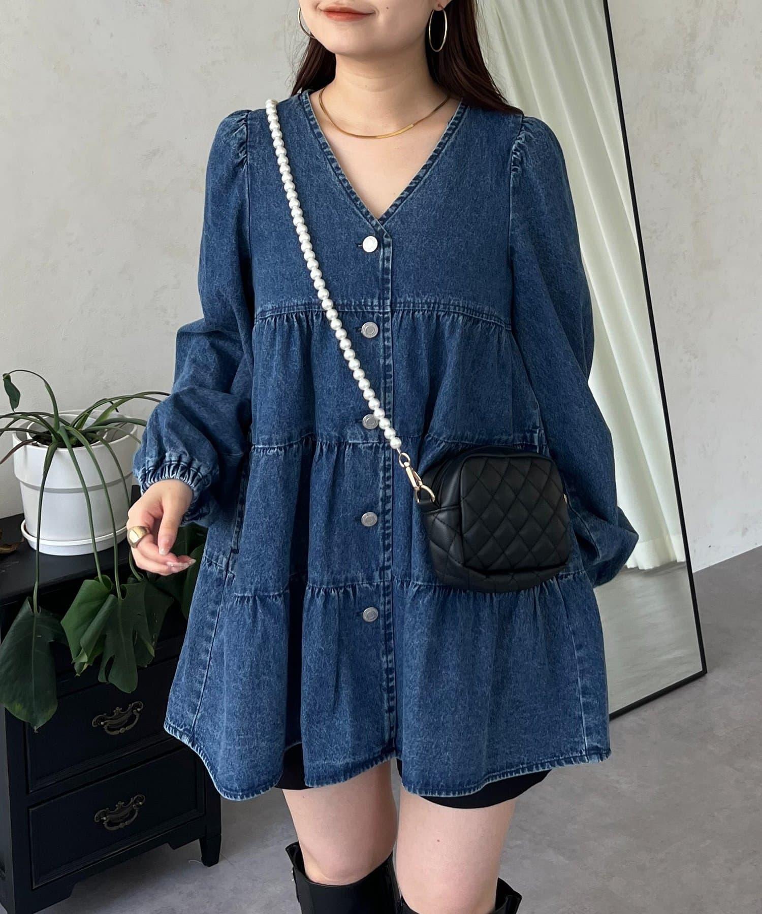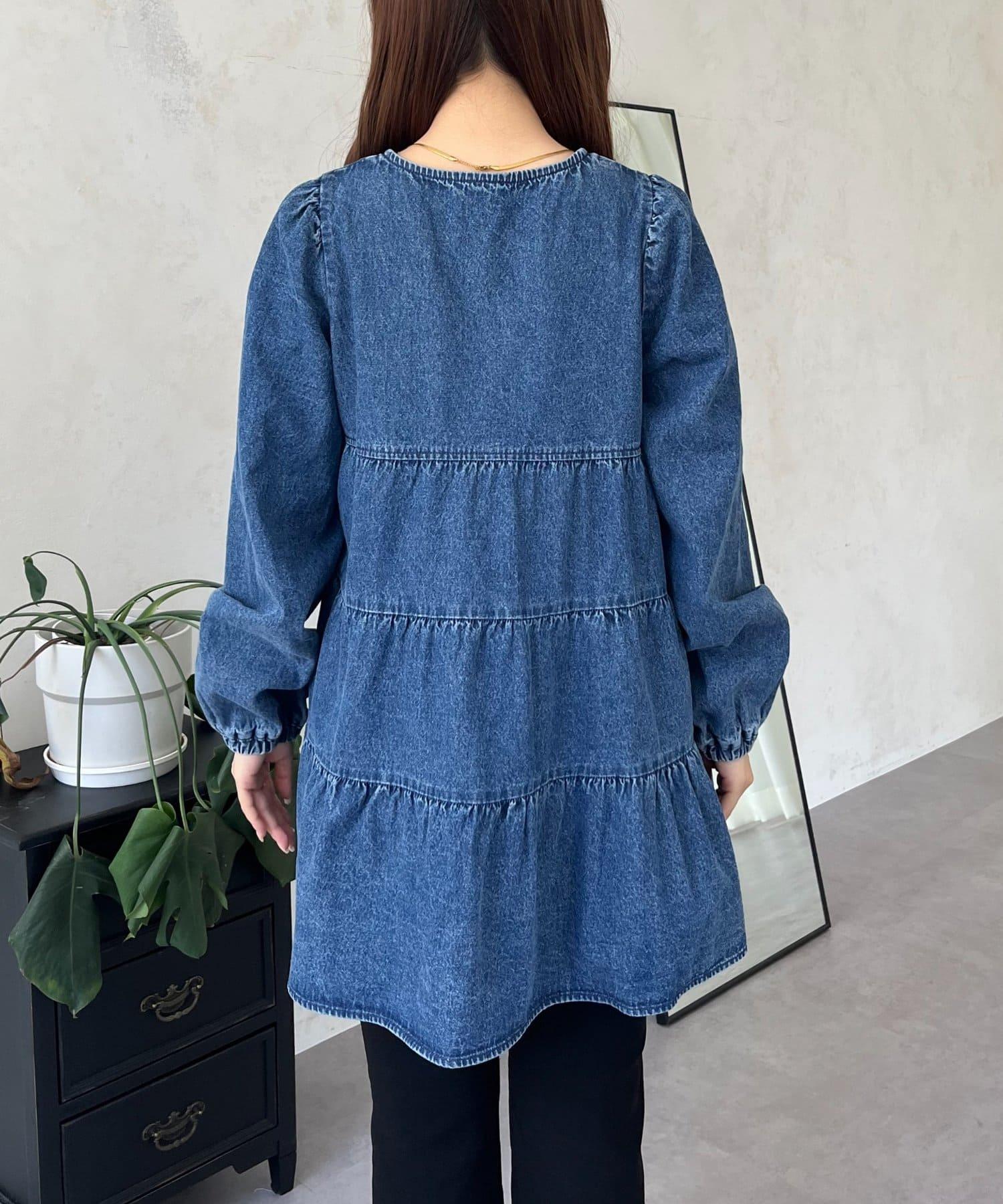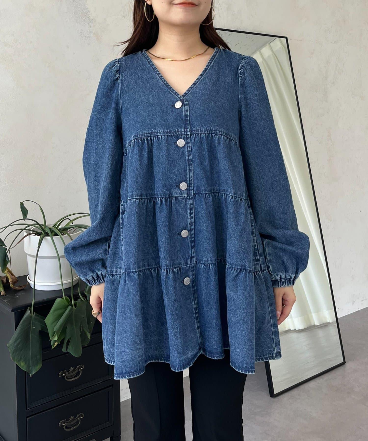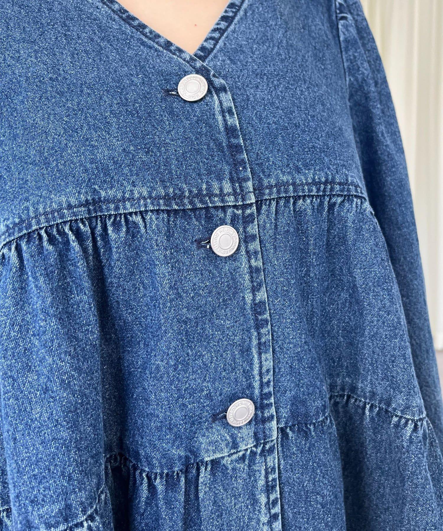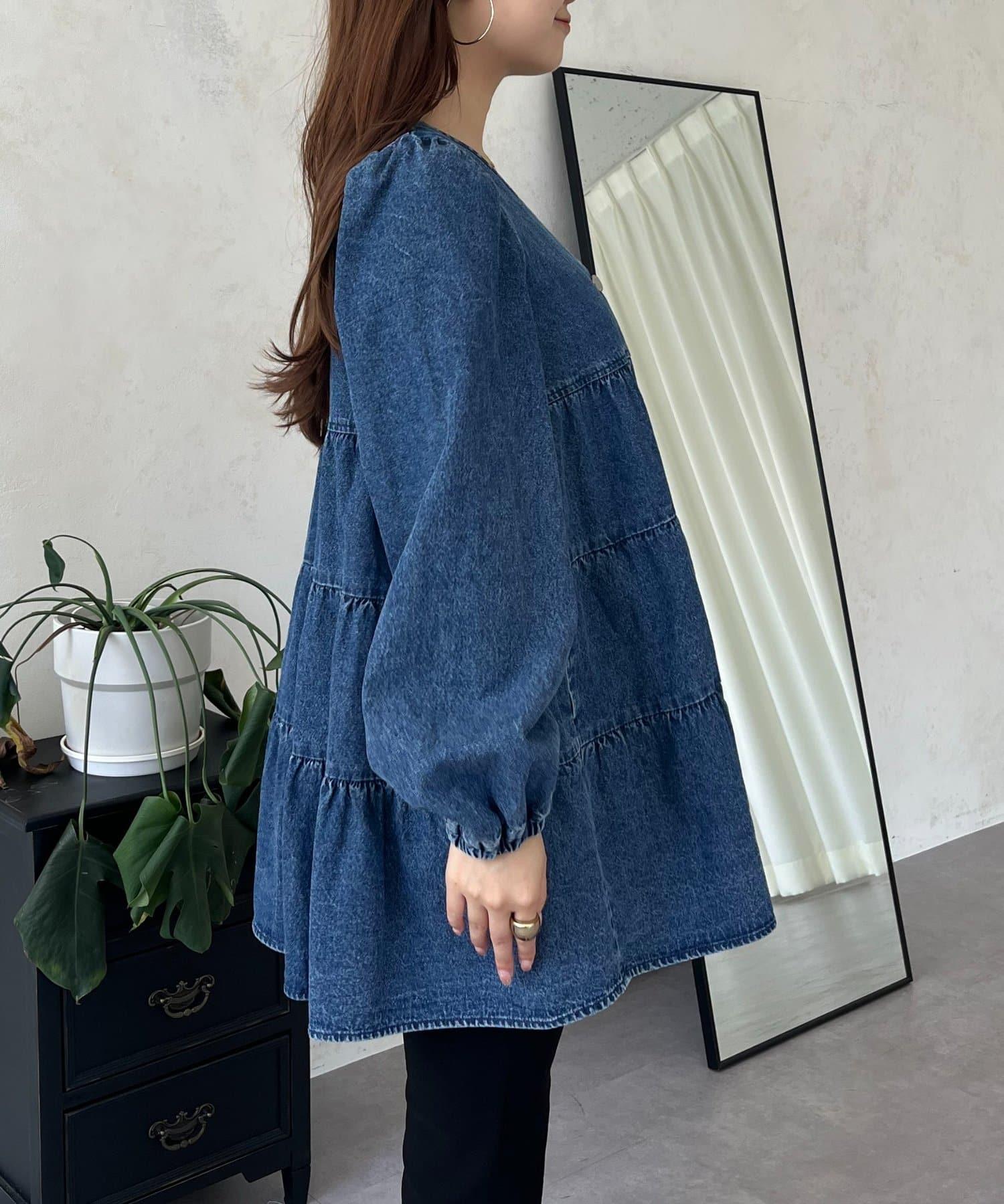 V領牛仔拼接層疊女襯衫