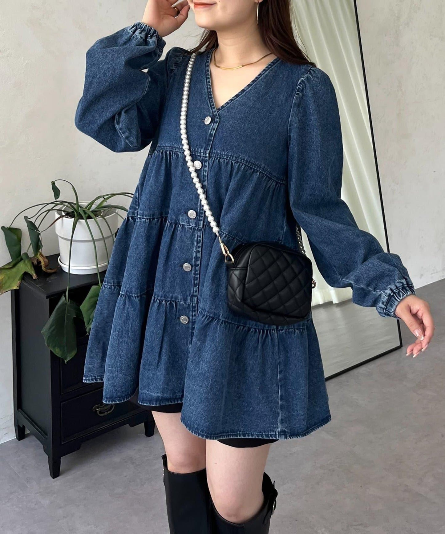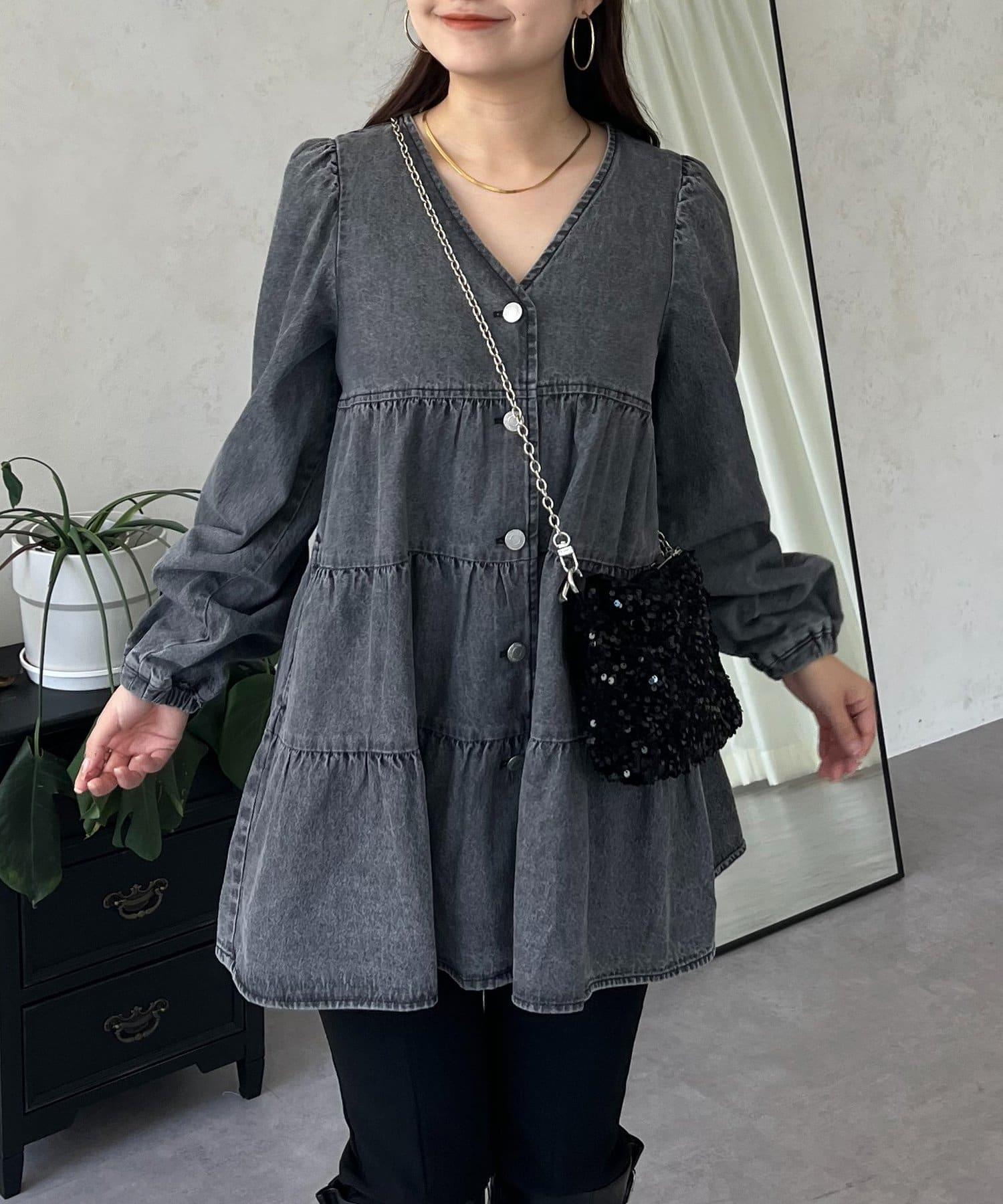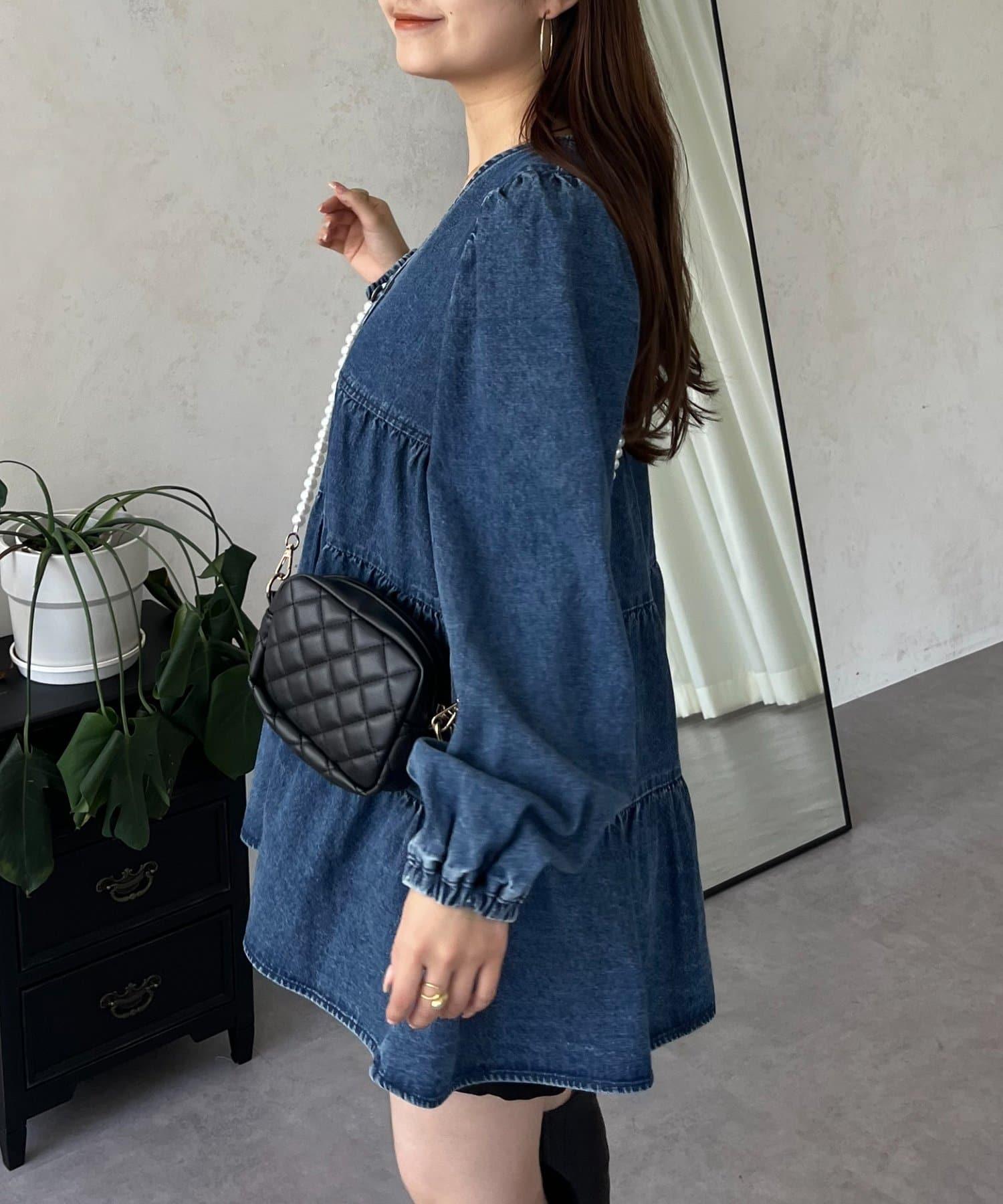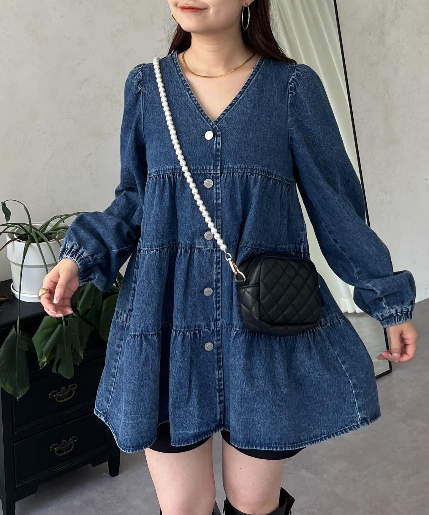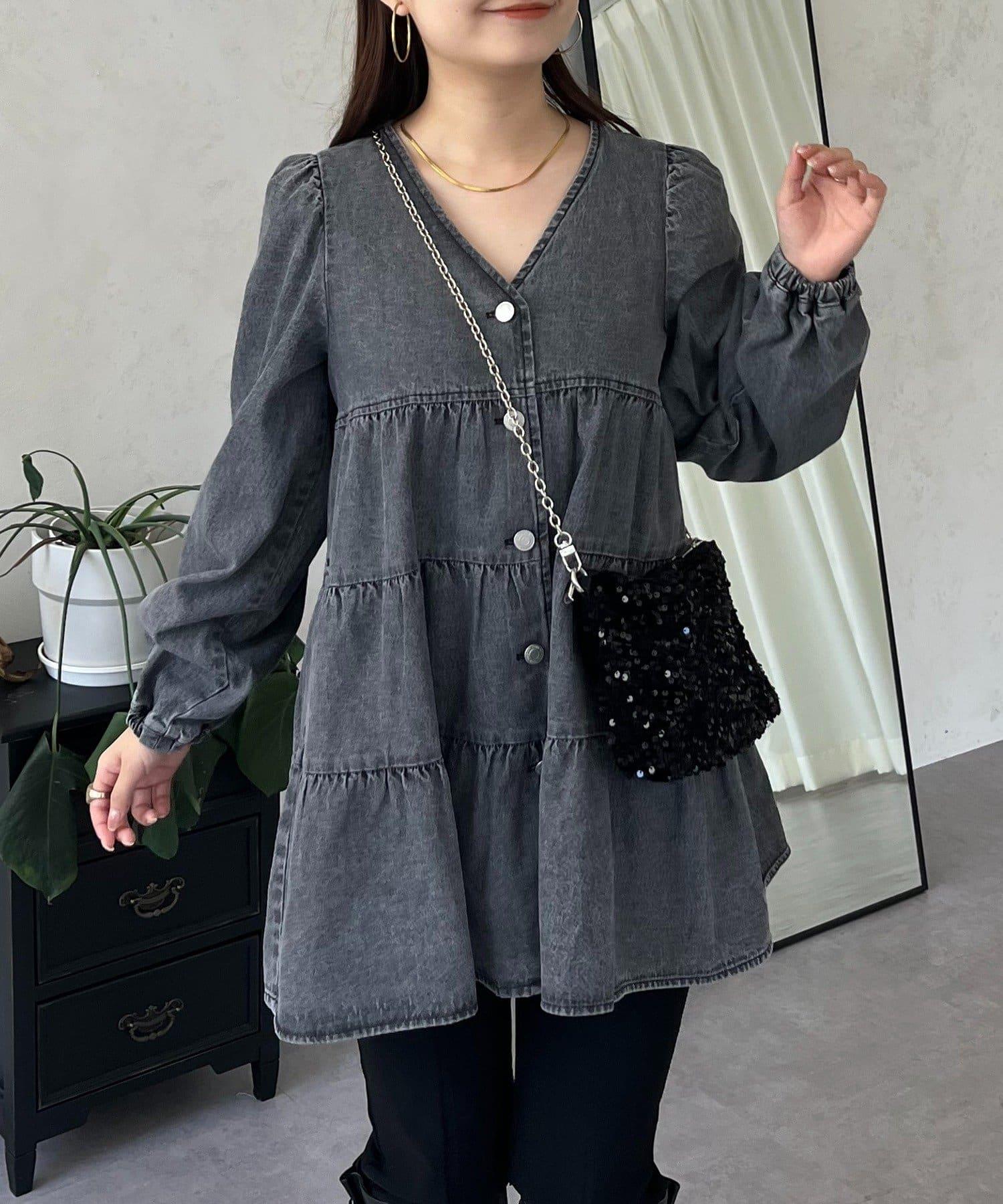 V領牛仔拼接層疊女襯衫