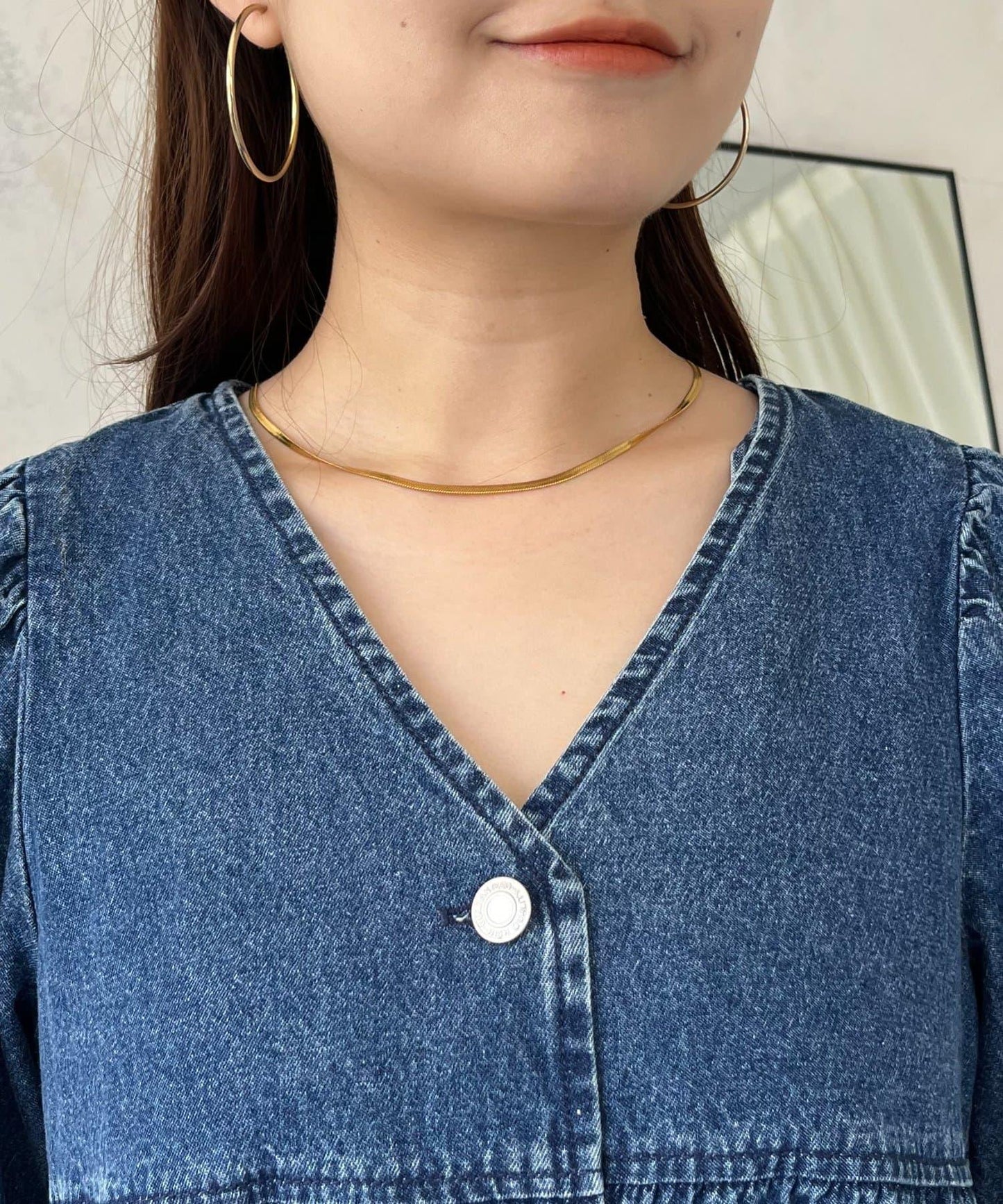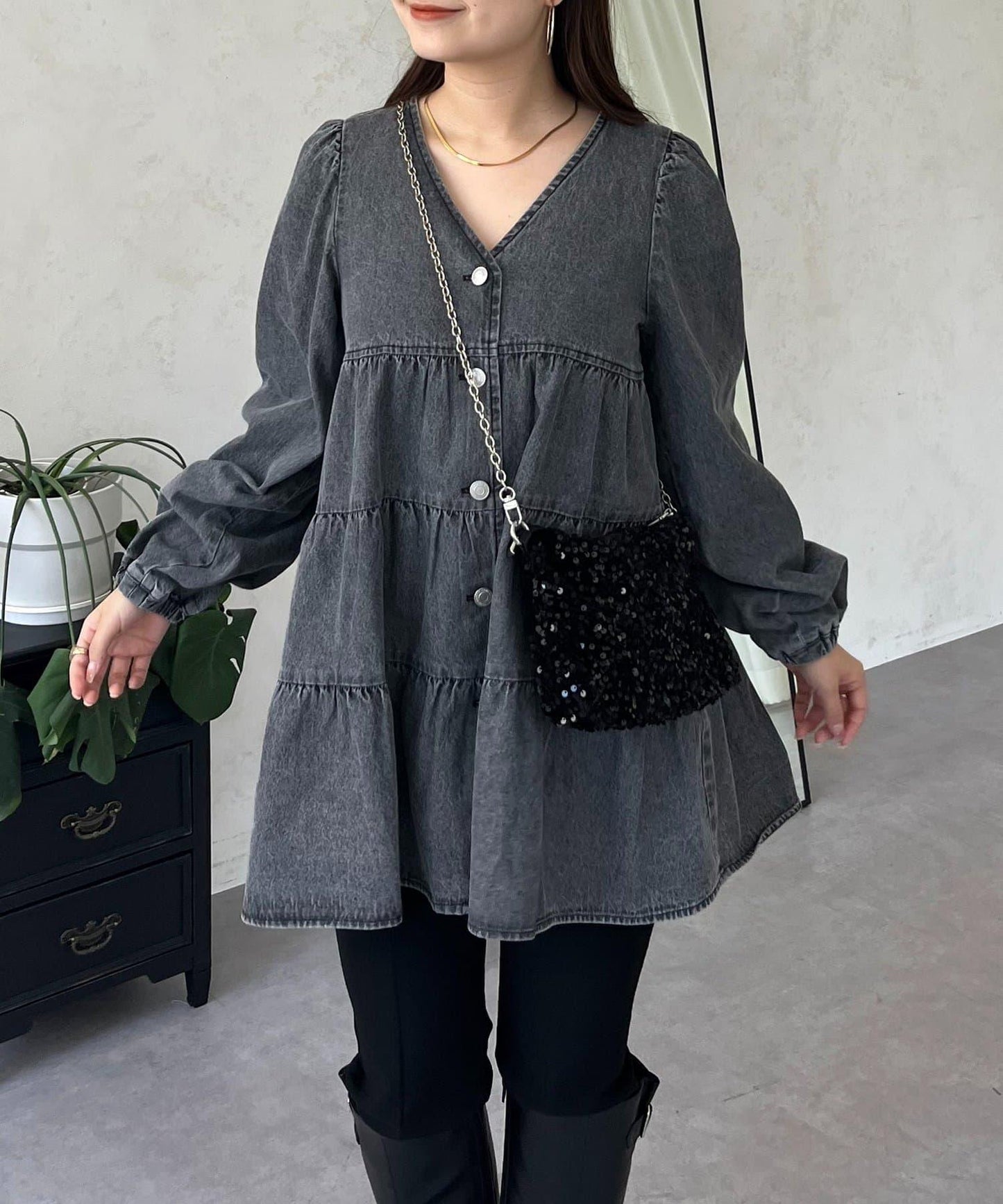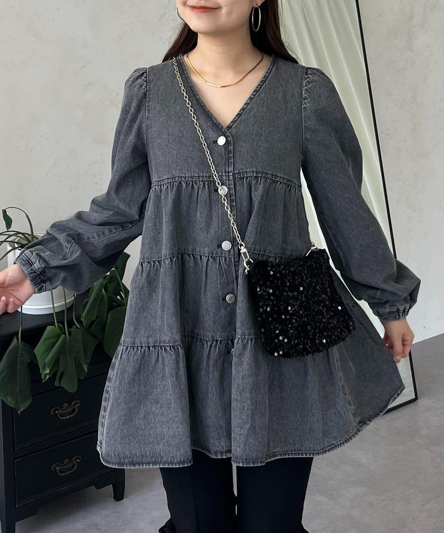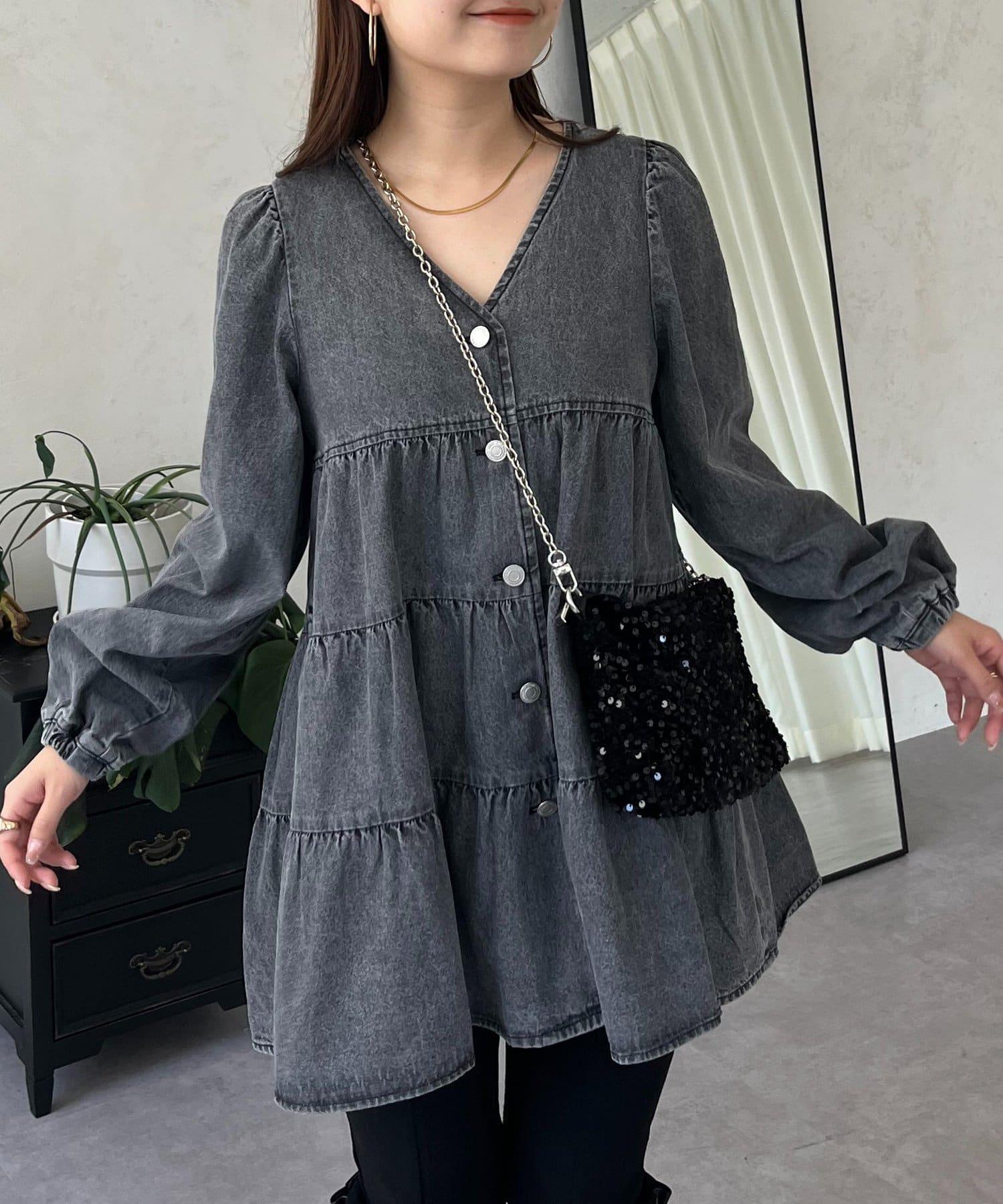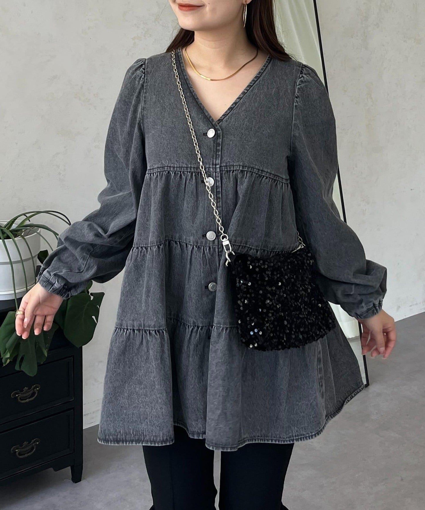 V領牛仔拼接層疊女襯衫