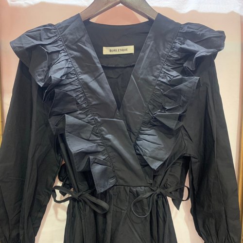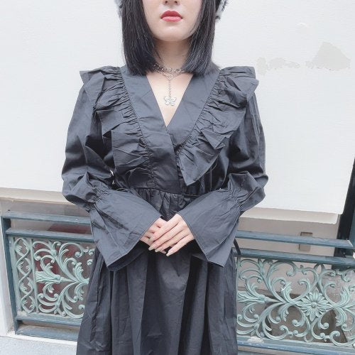 V領荷葉邊側緞帶連衣裙 黑色【特價】(CD4257)