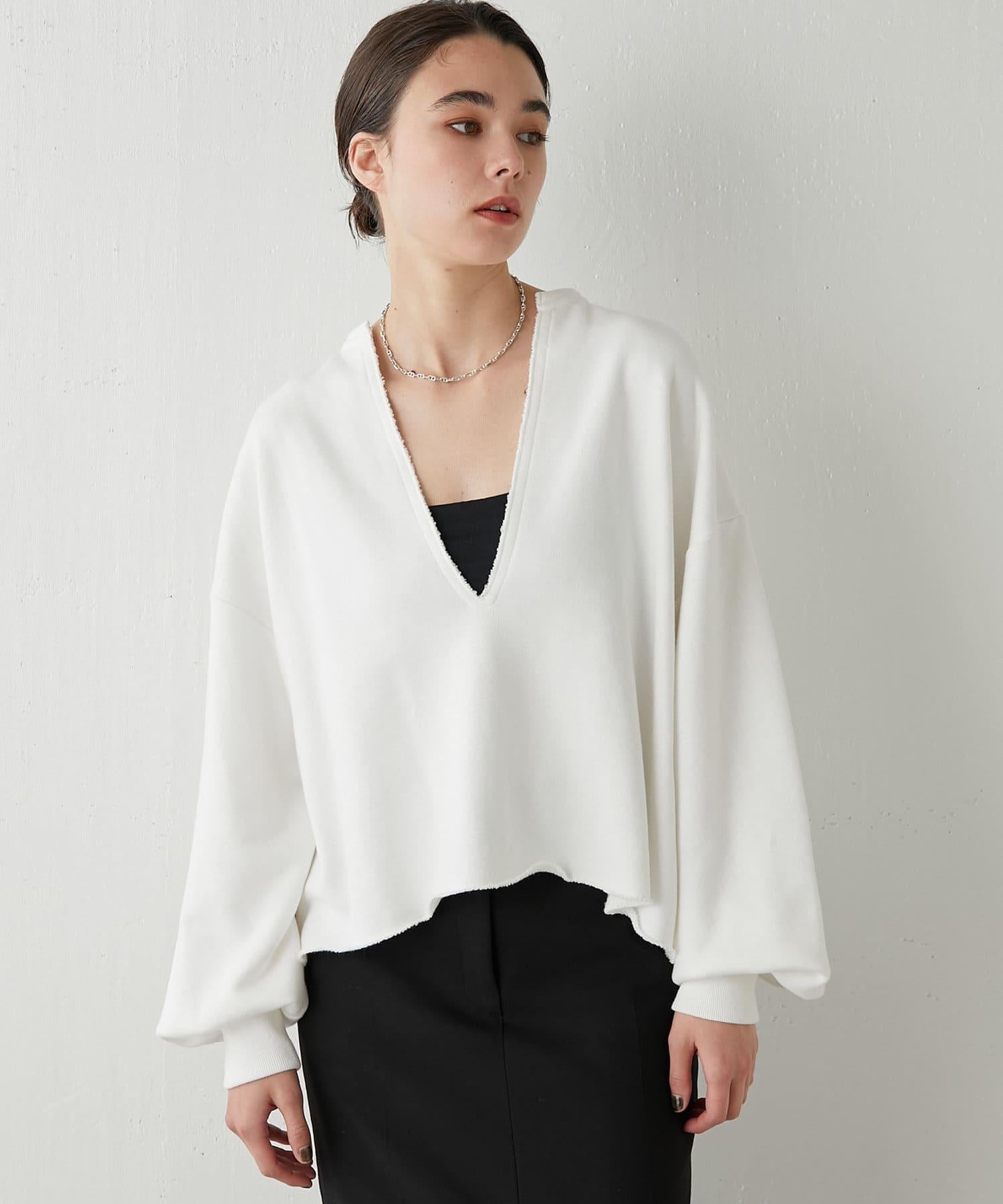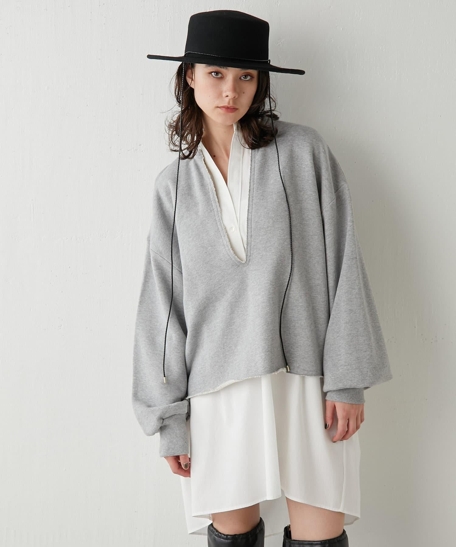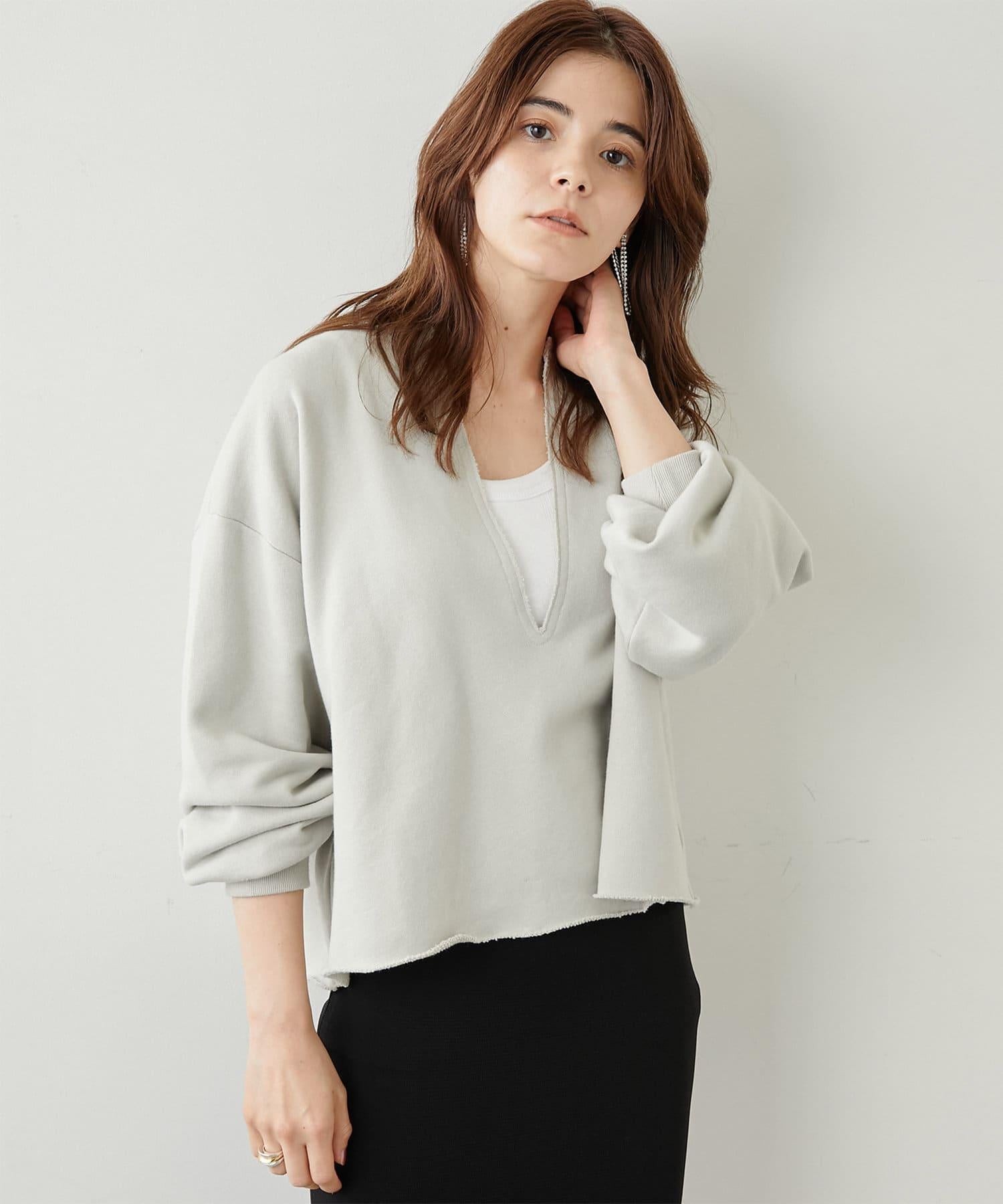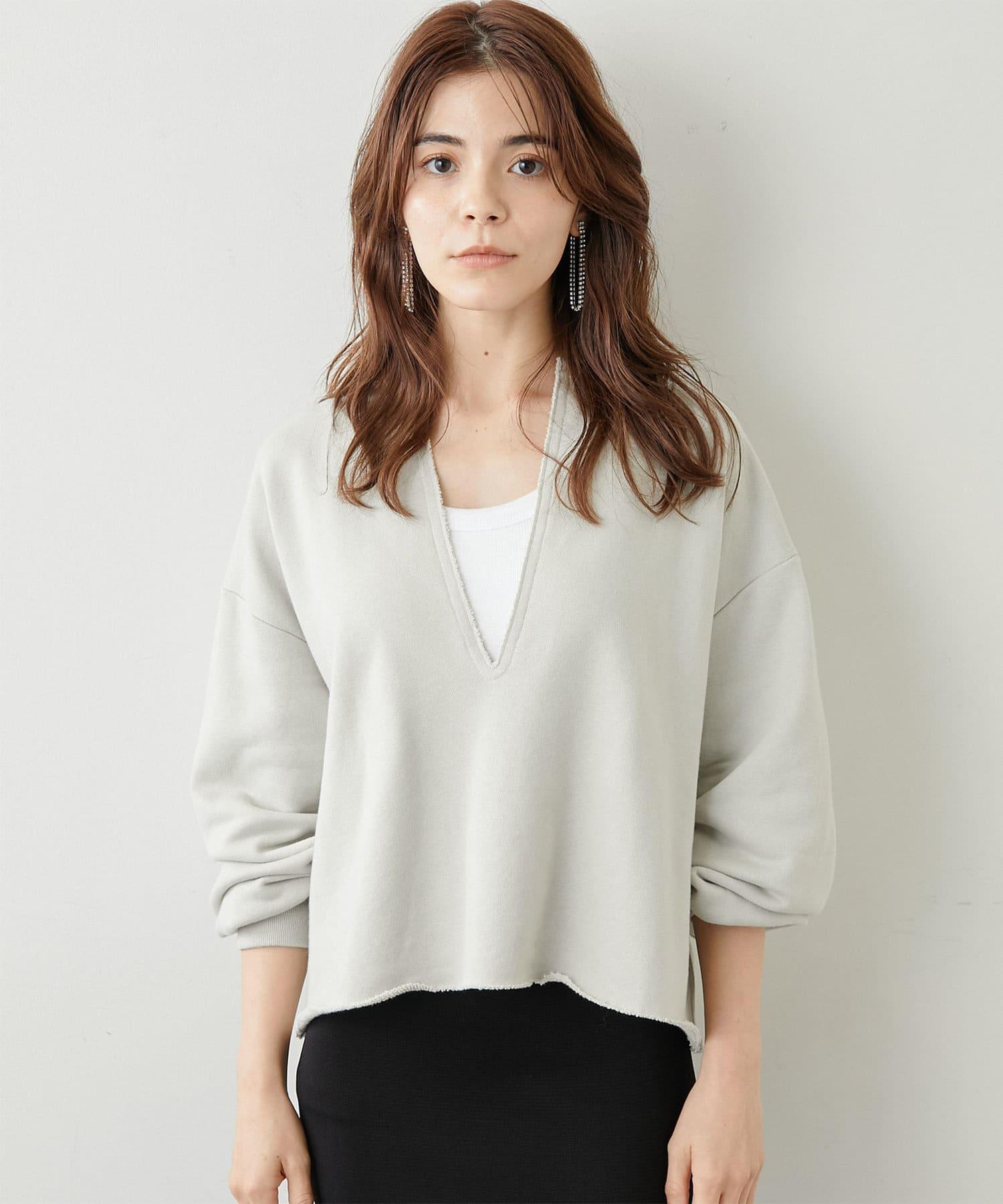 在商店裡非常受歡迎的運動衫。深 V 領設計,可與 T 恤、高領毛衣等不同內搭搭配穿著。