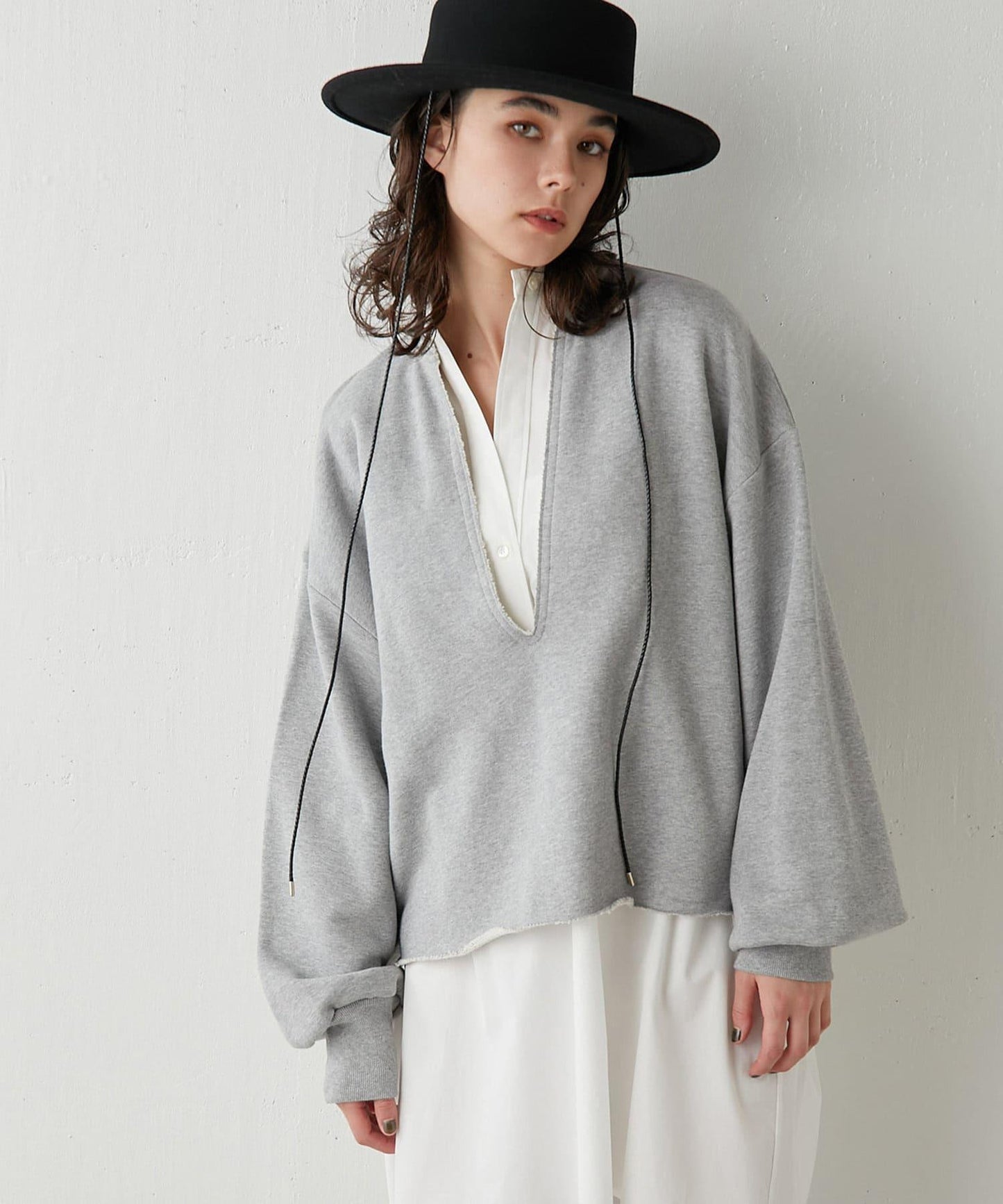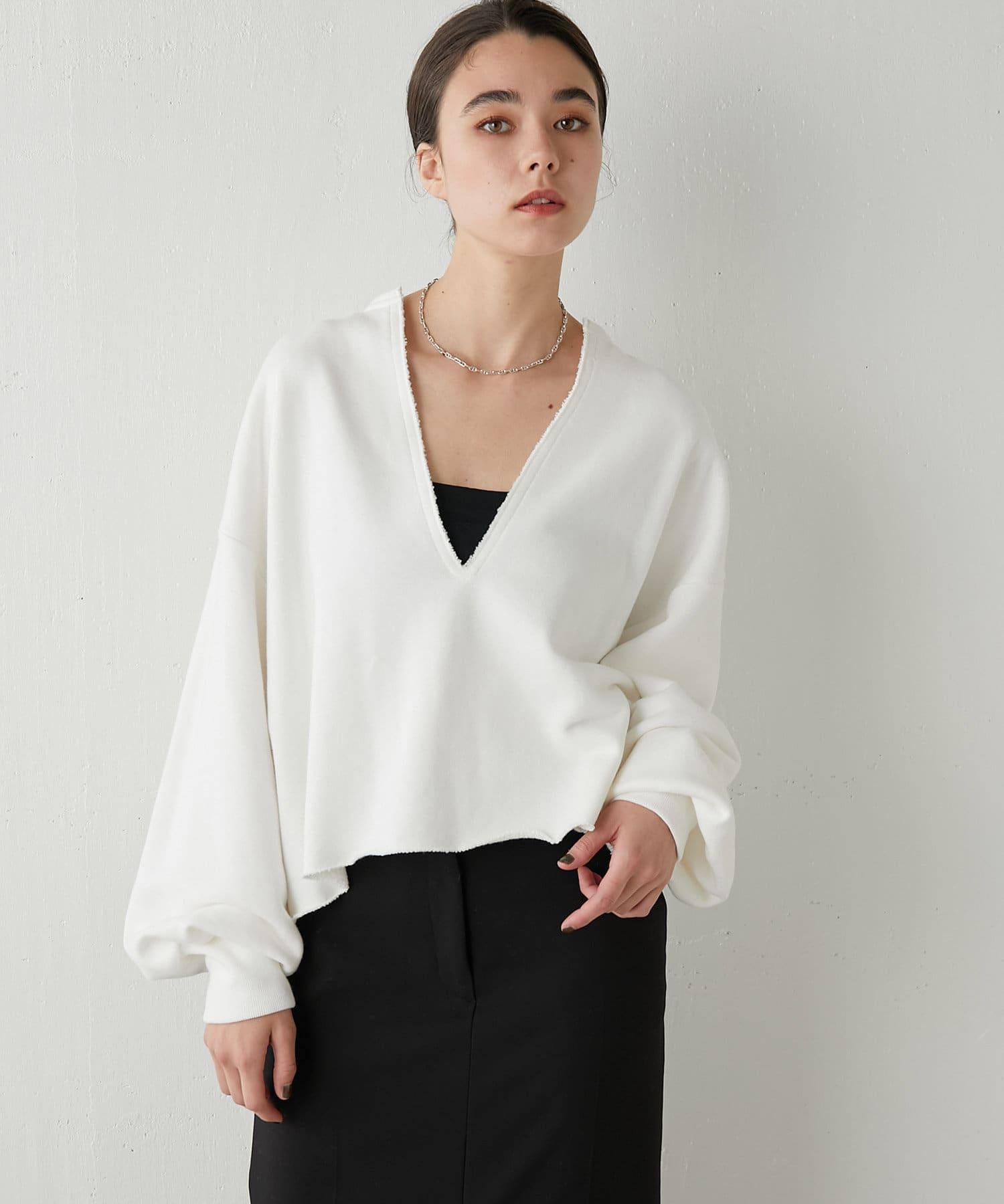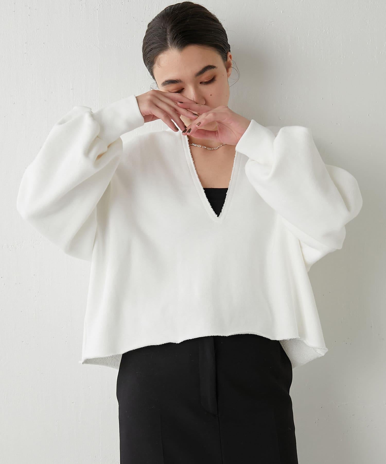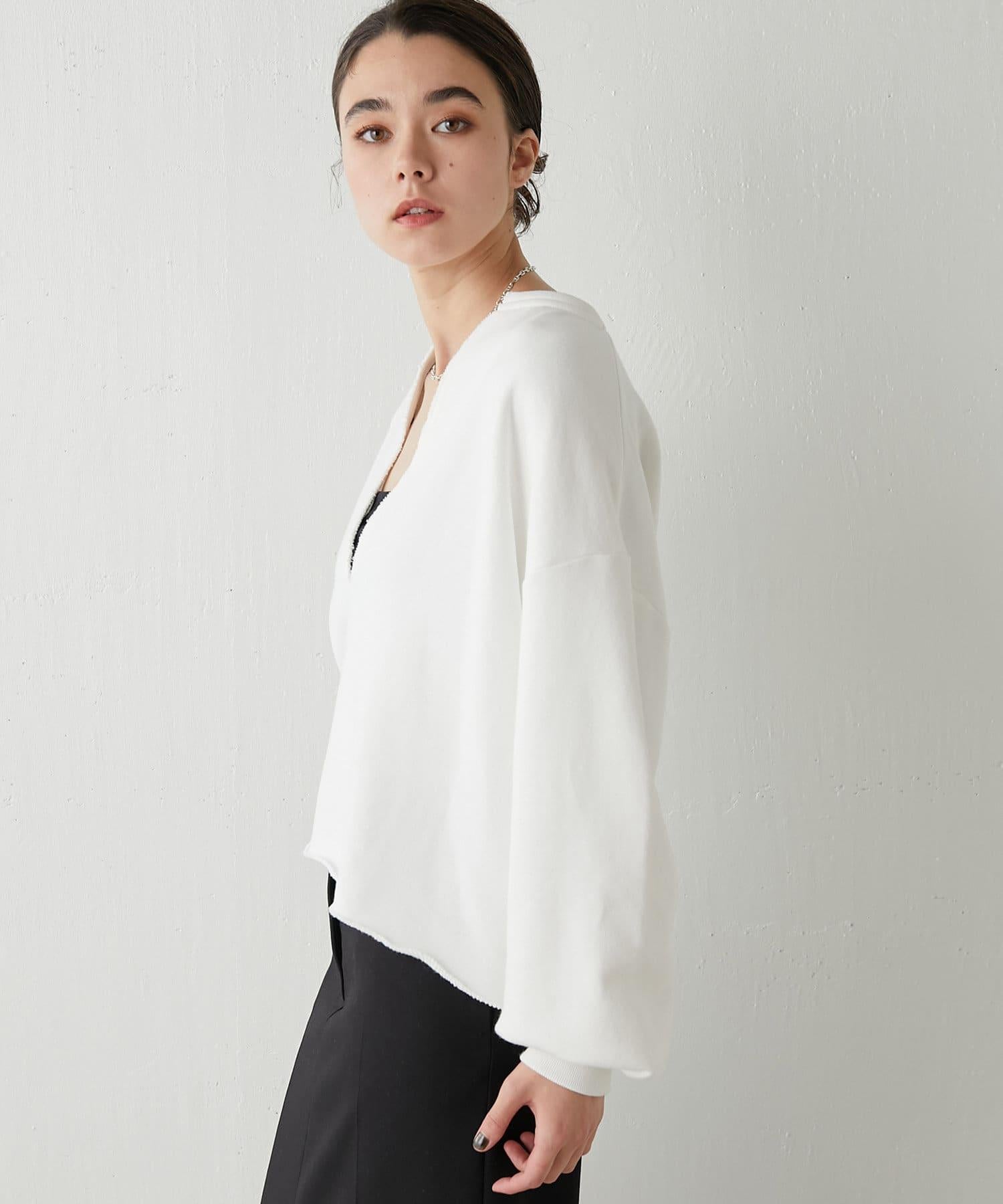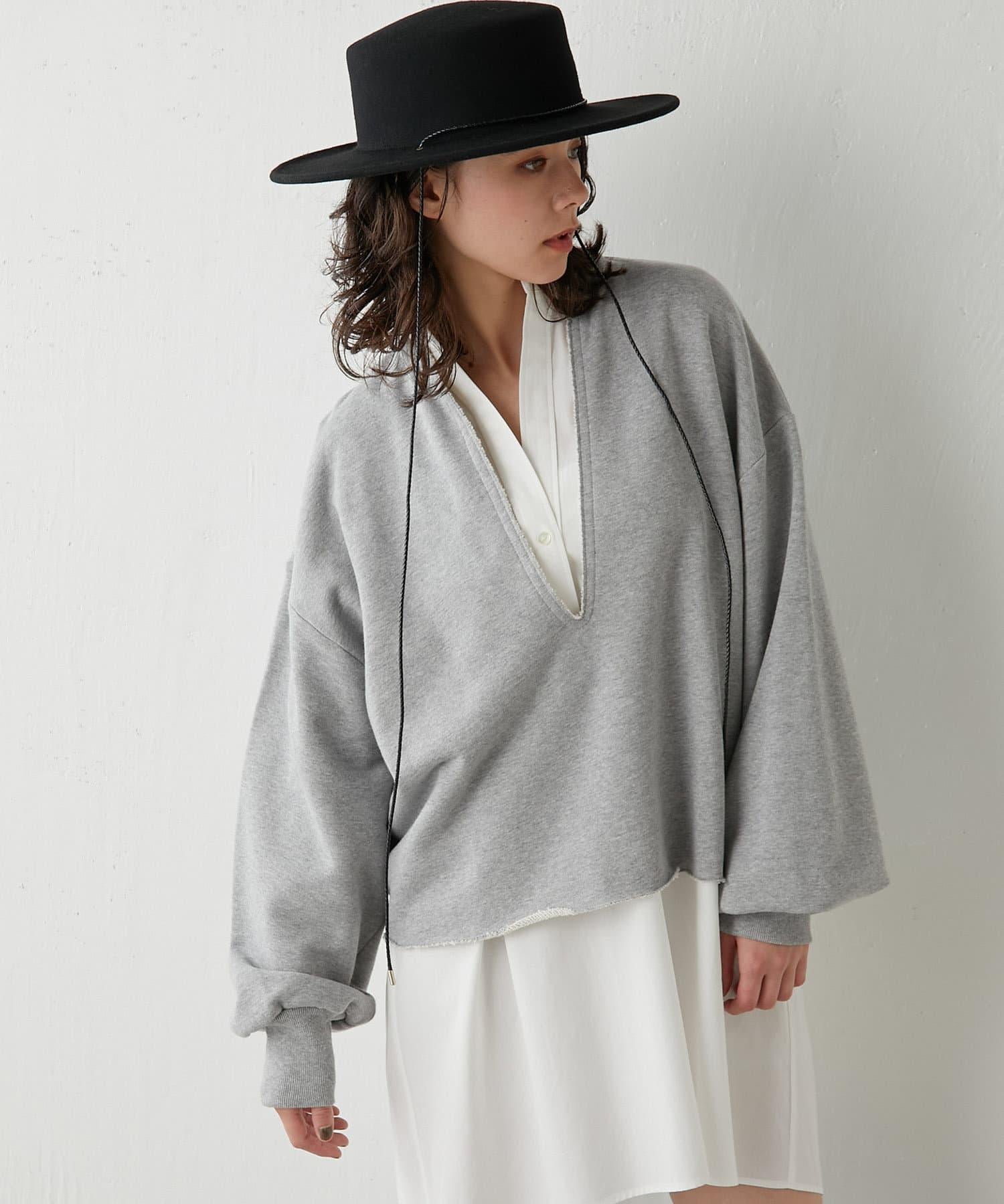 在商店裡非常受歡迎的運動衫。深 V 領設計,可與 T 恤、高領毛衣等不同內搭搭配穿著。