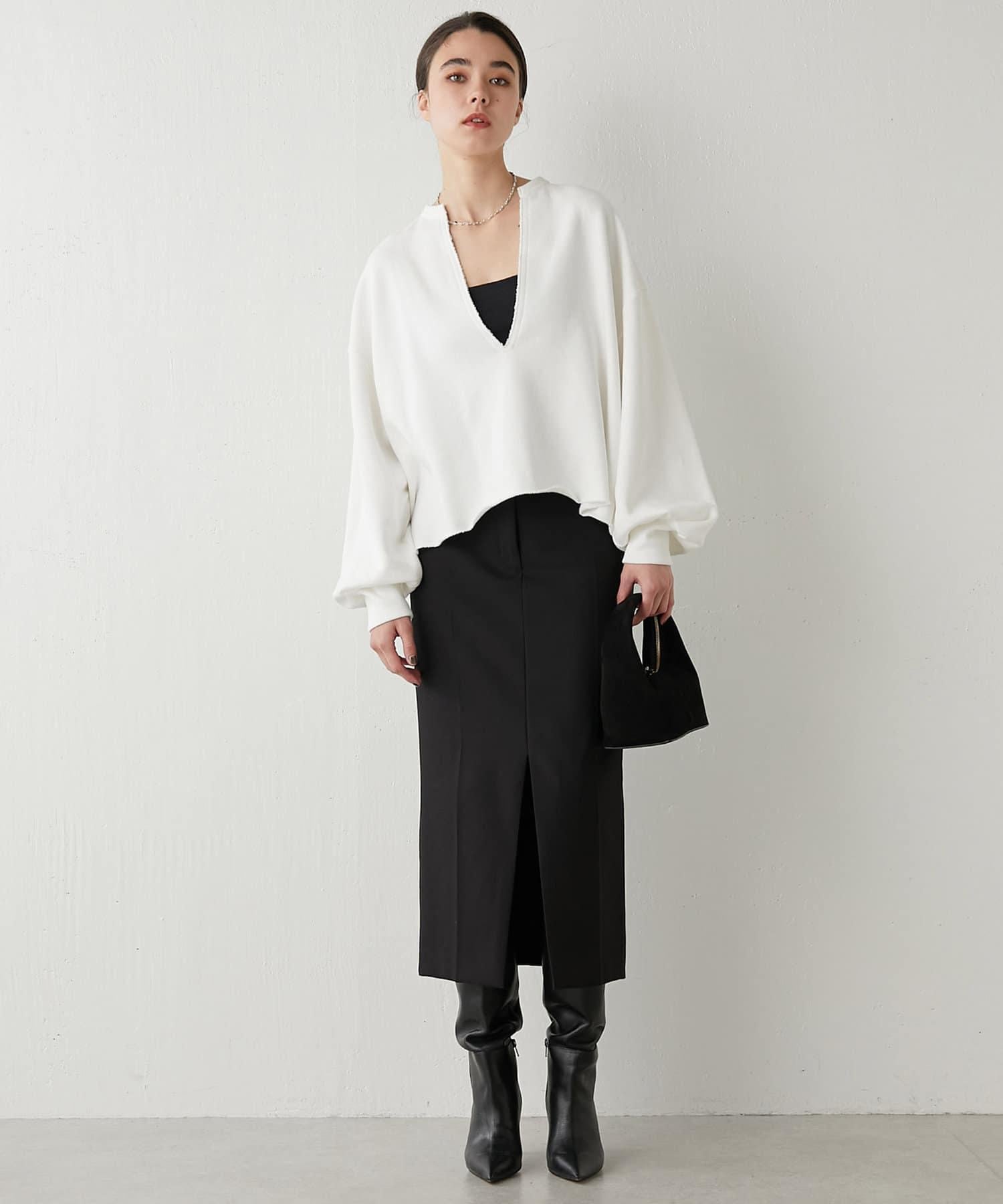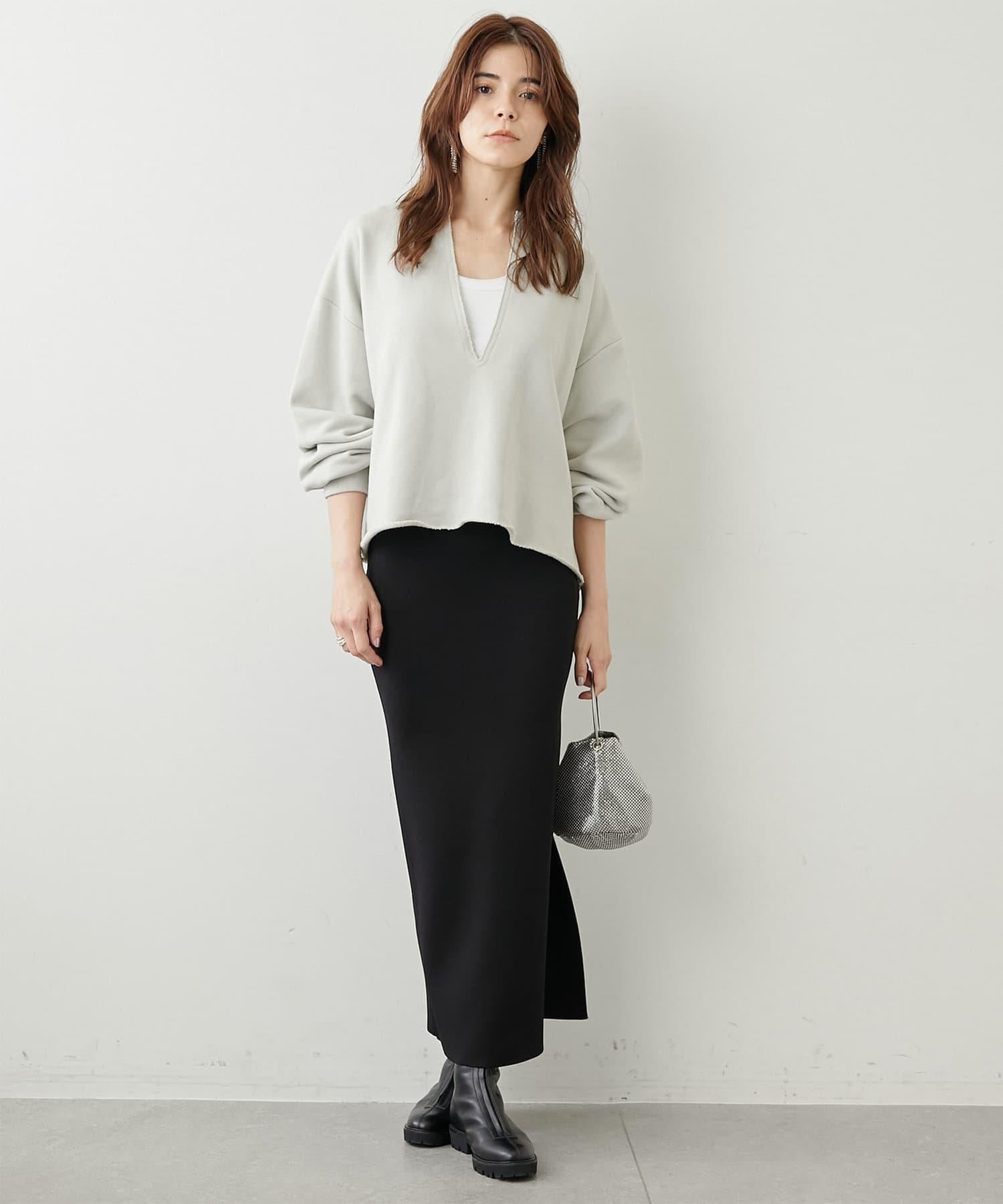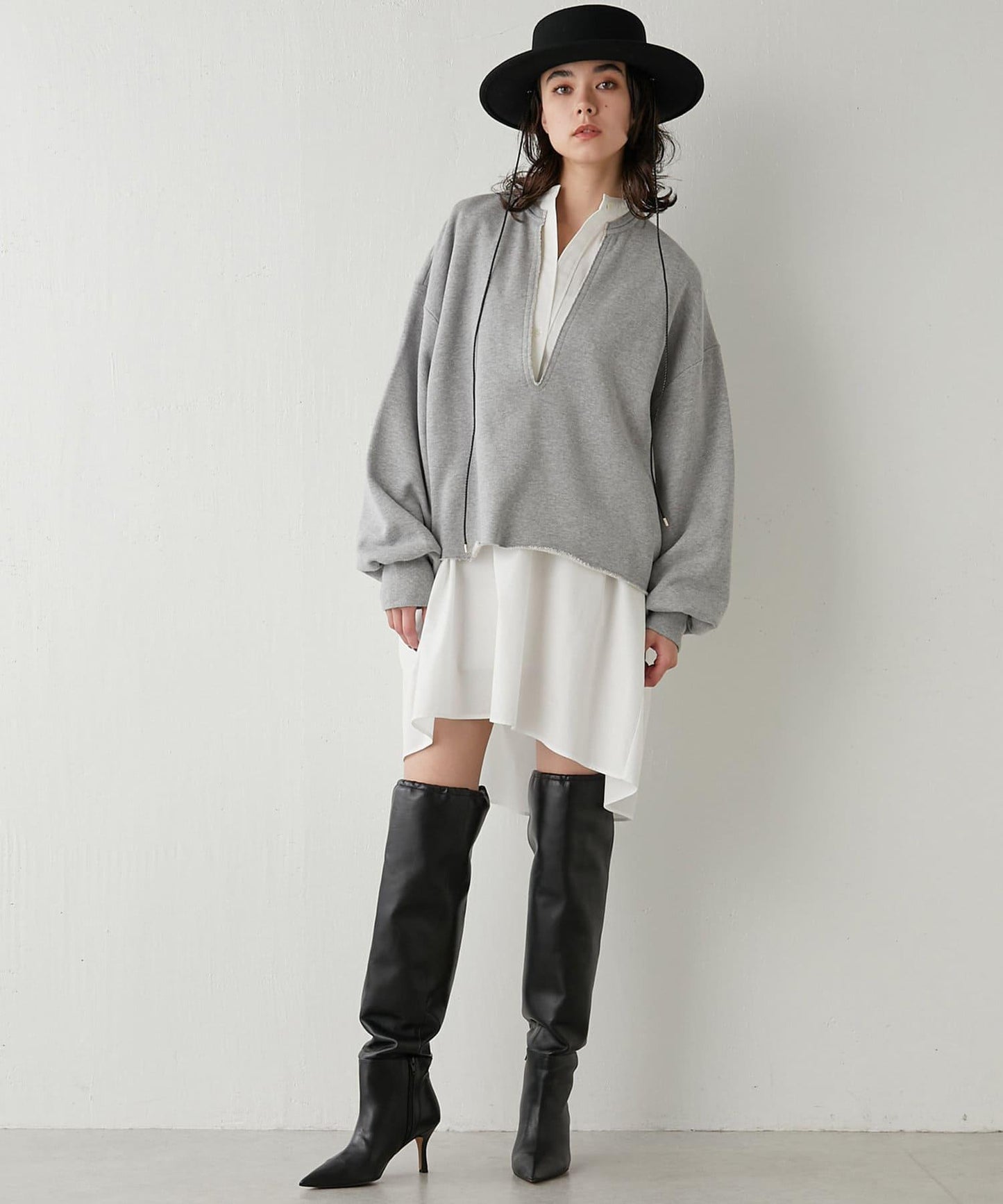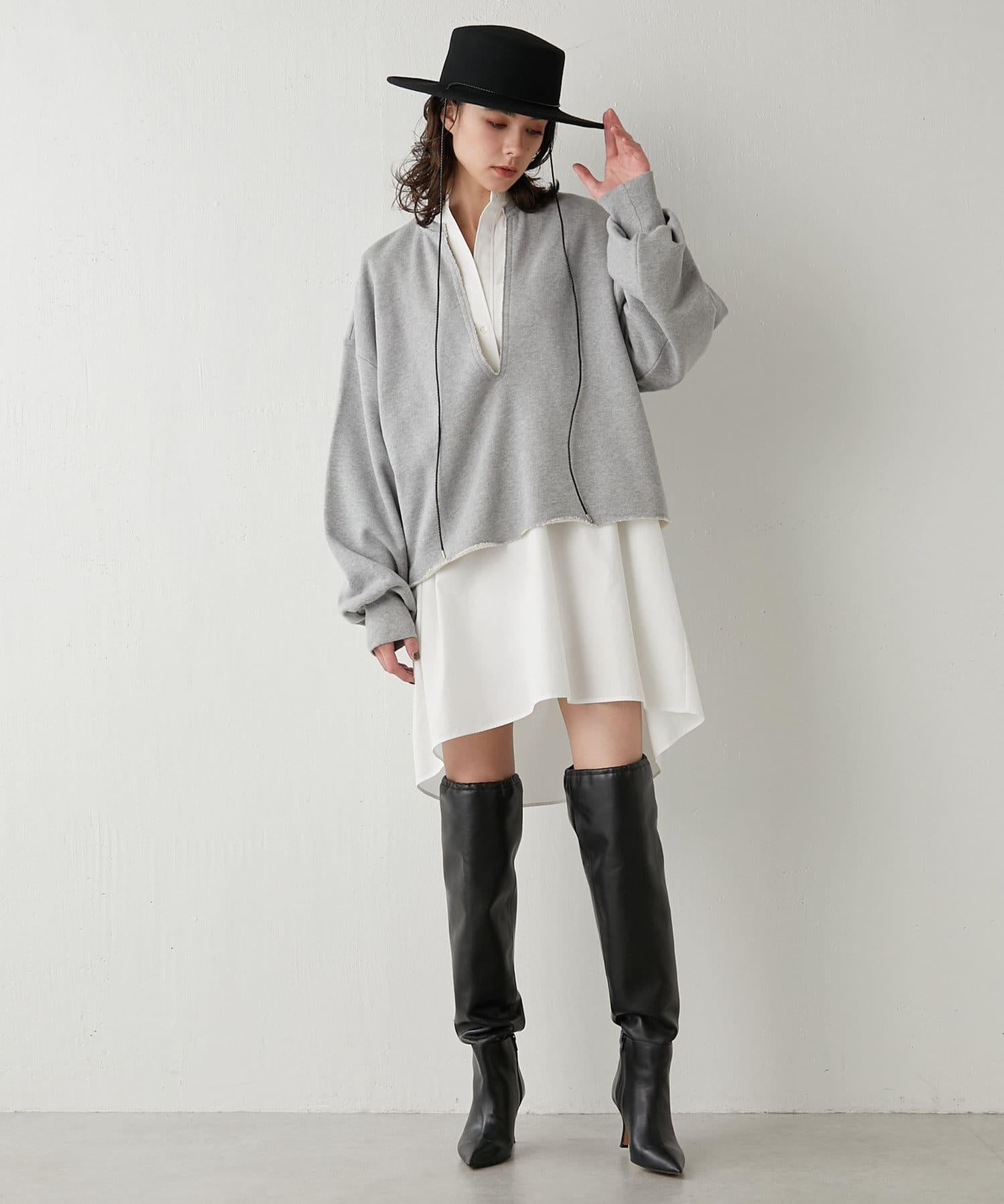 在商店裡非常受歡迎的運動衫。深 V 領設計,可與 T 恤、高領毛衣等不同內搭搭配穿著。