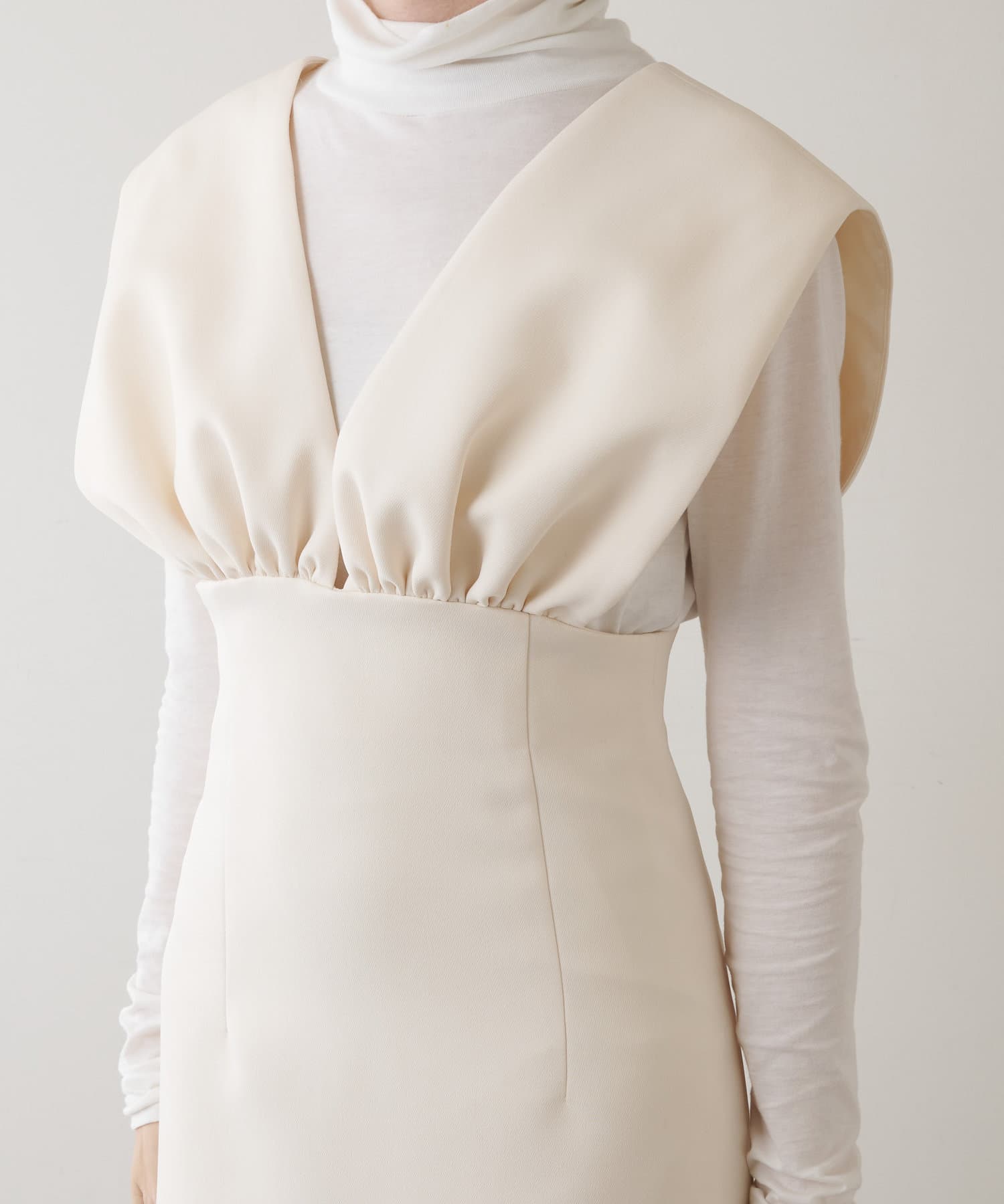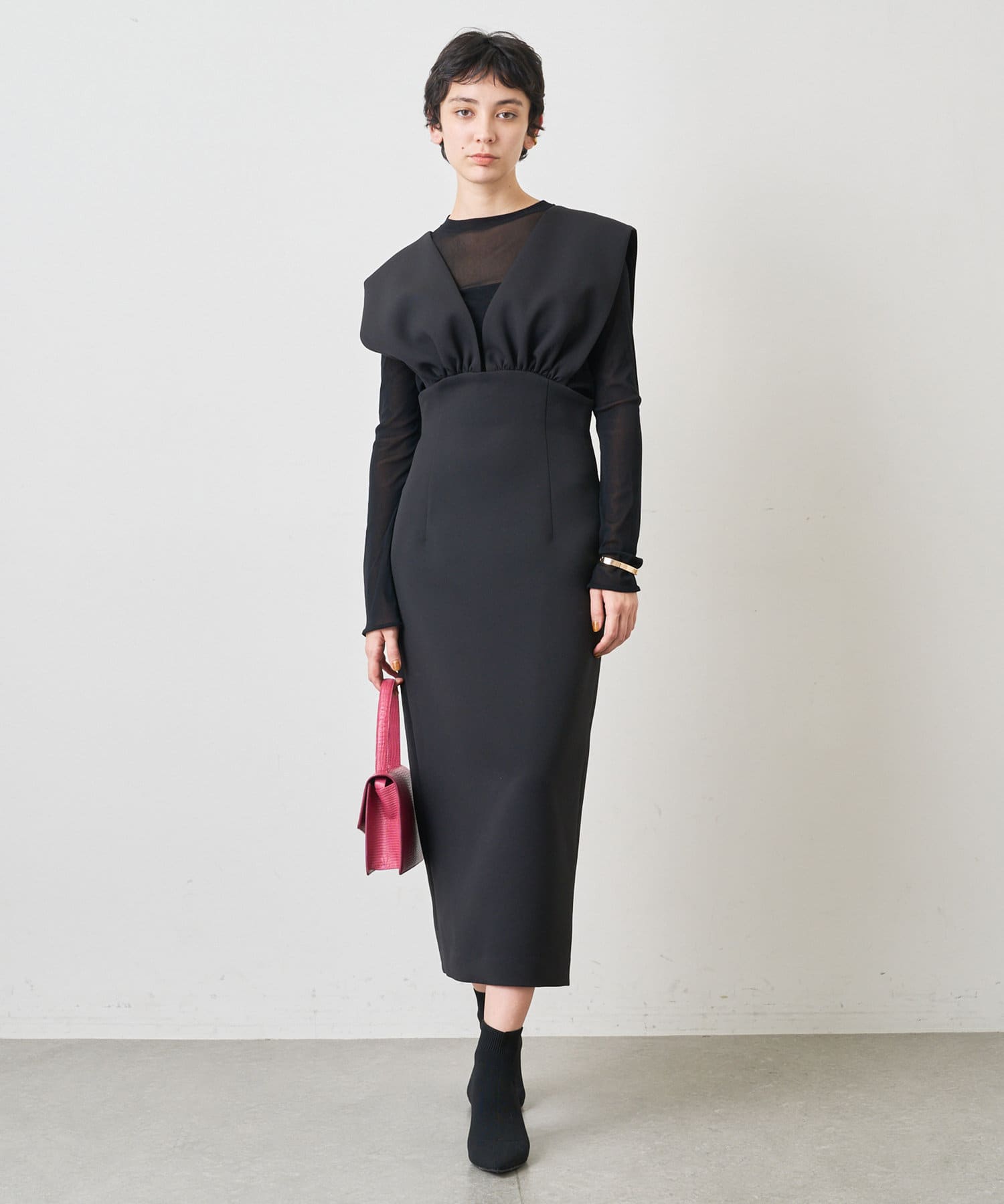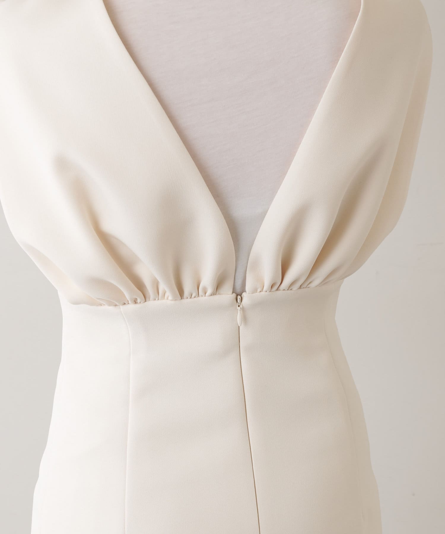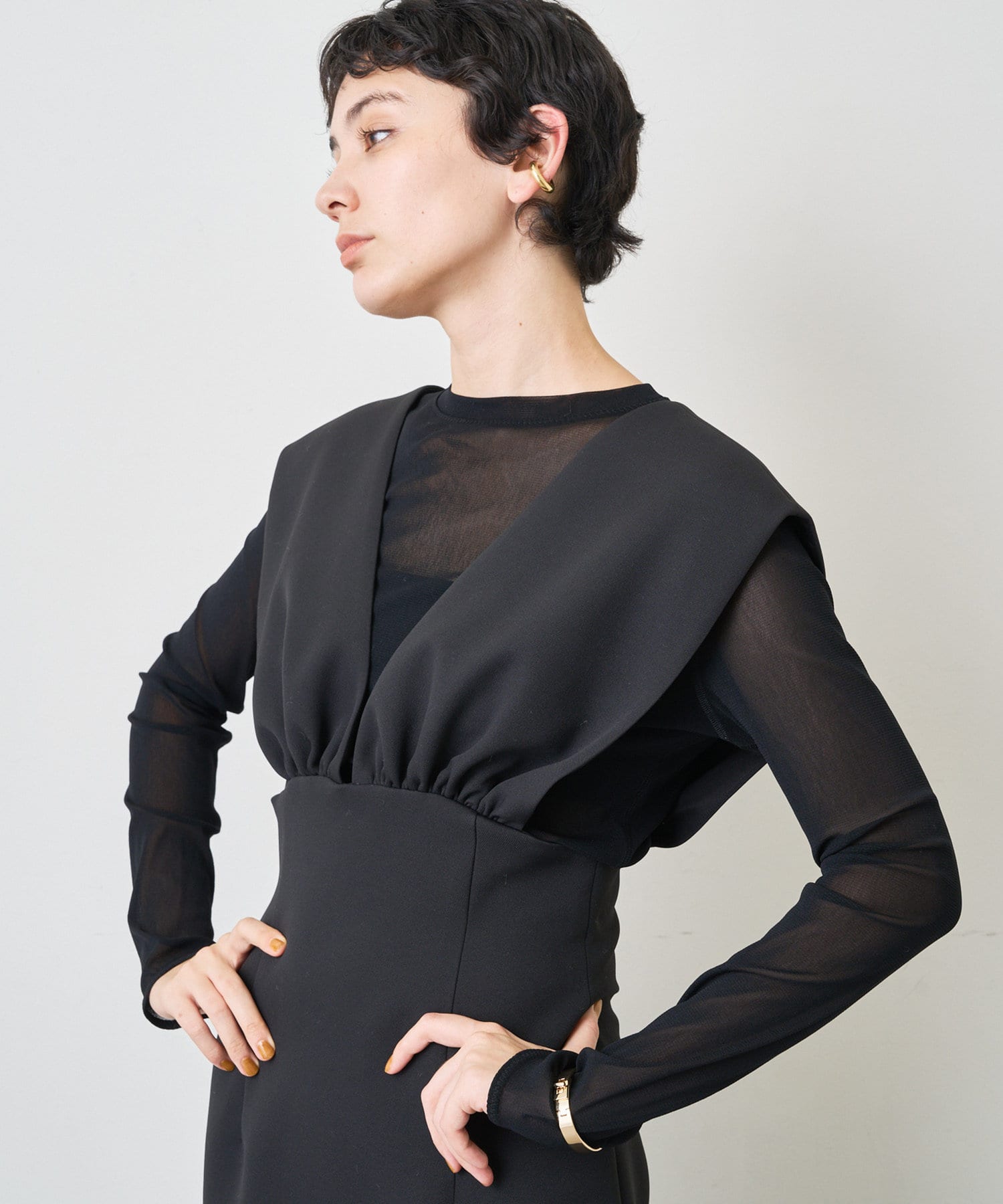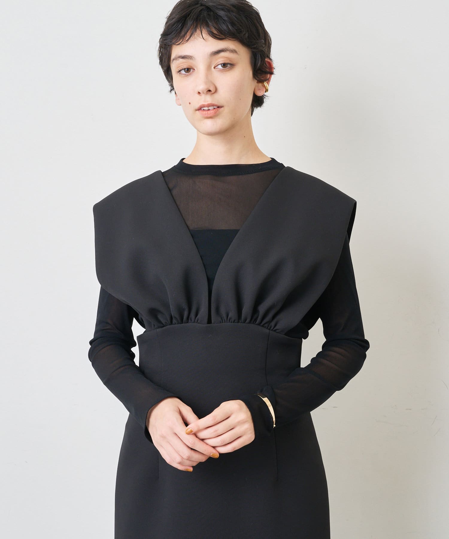 V形的開口增加了銳利的印象,而胸前的褶皺使其具有女性化的設計。