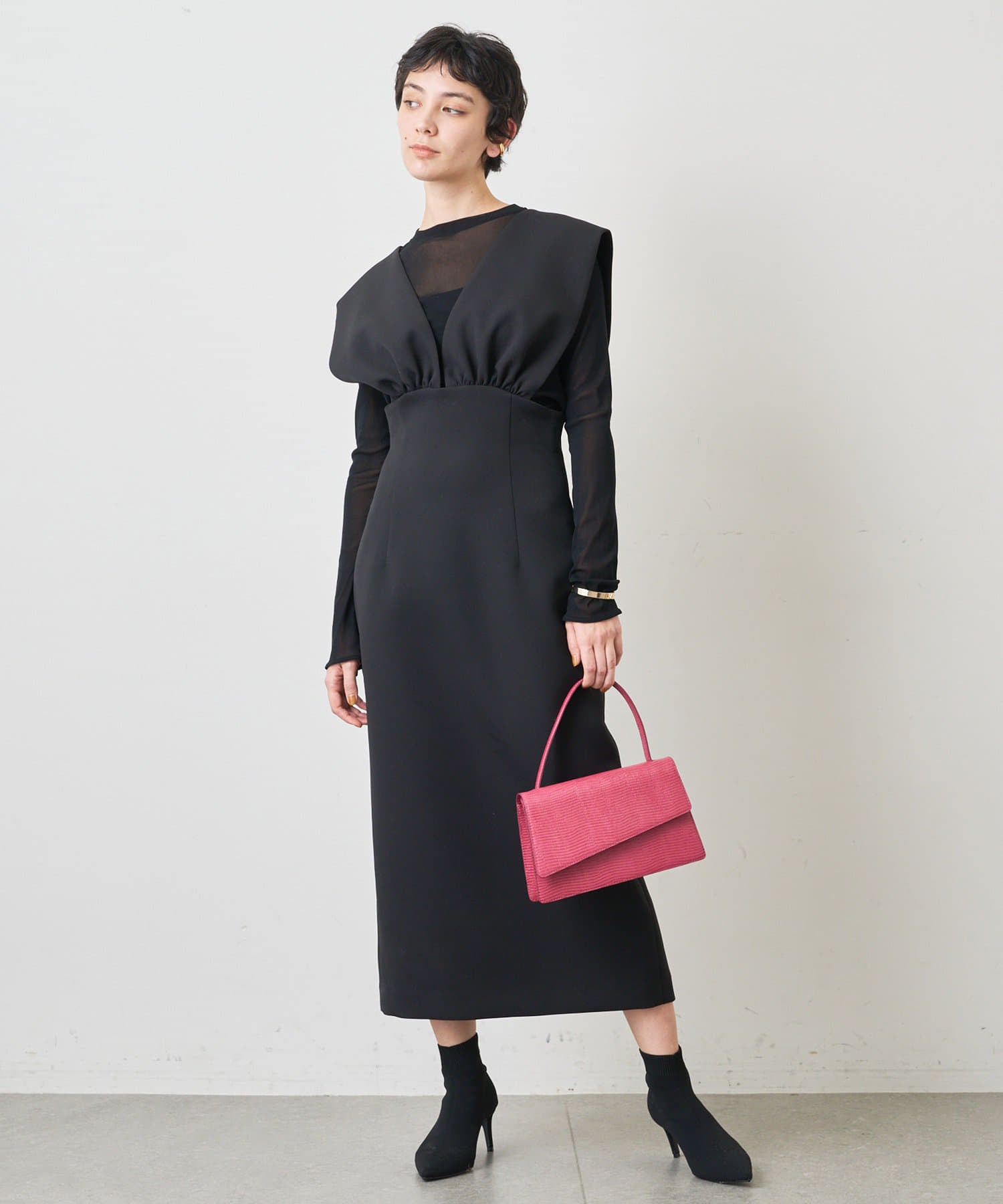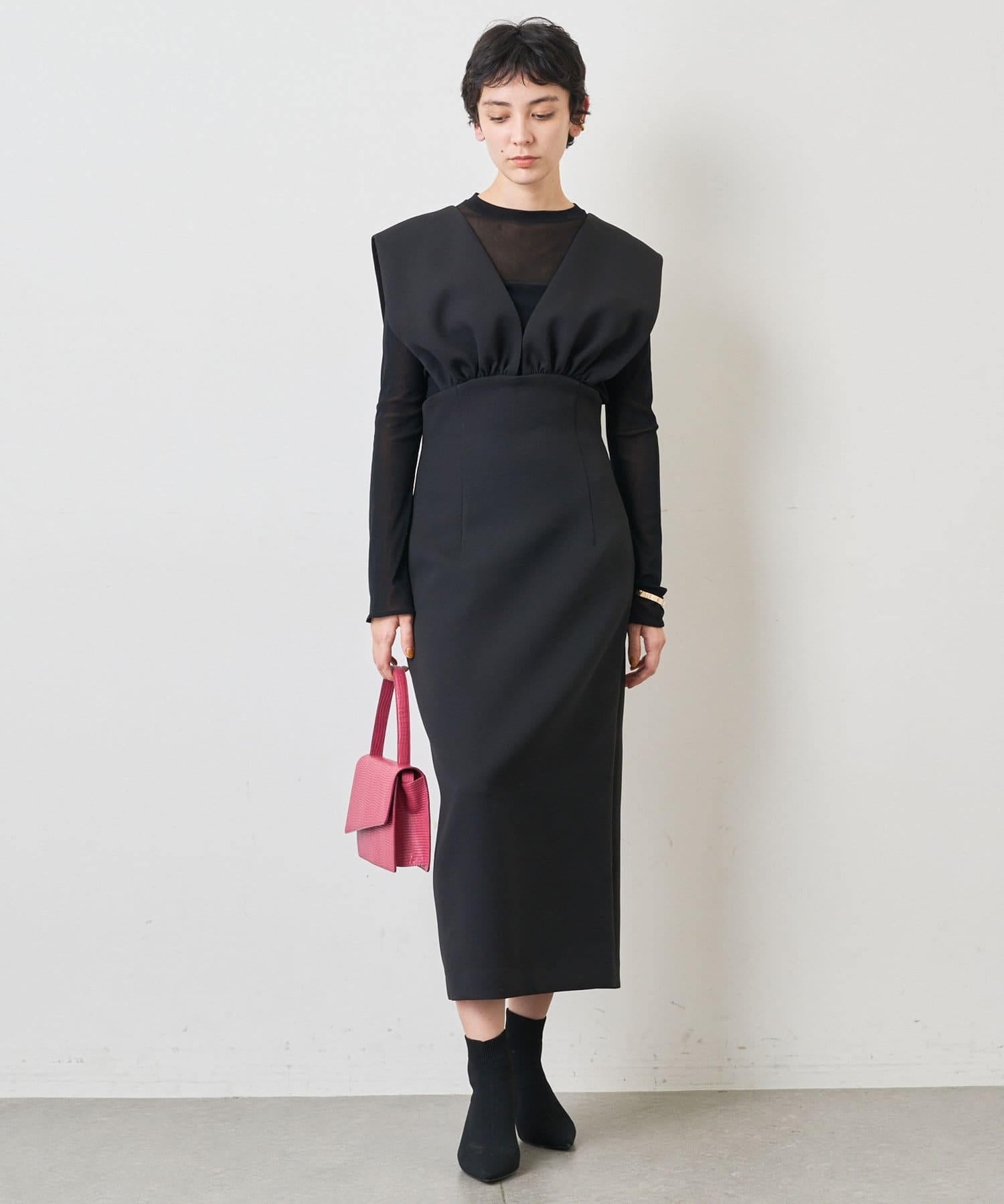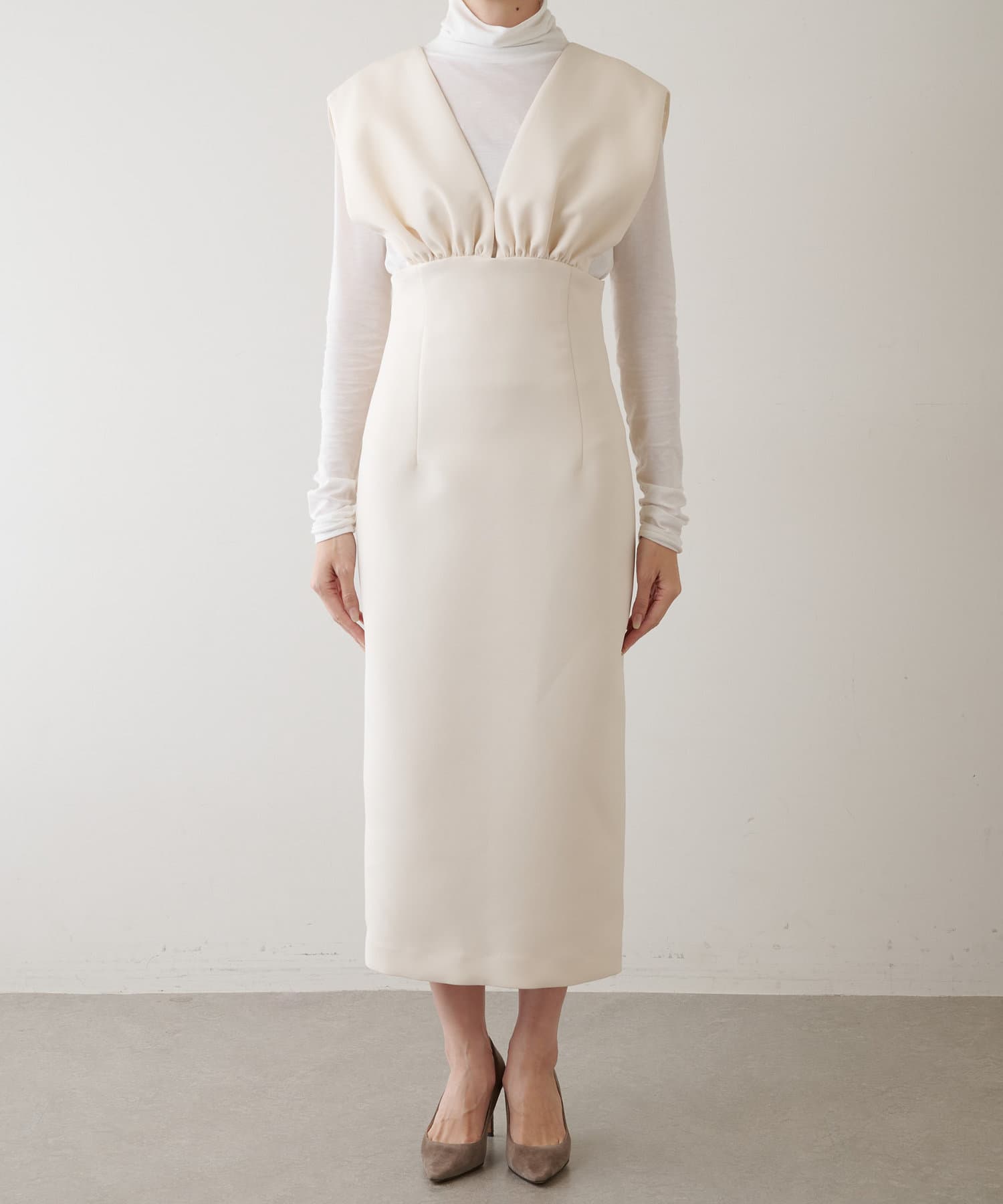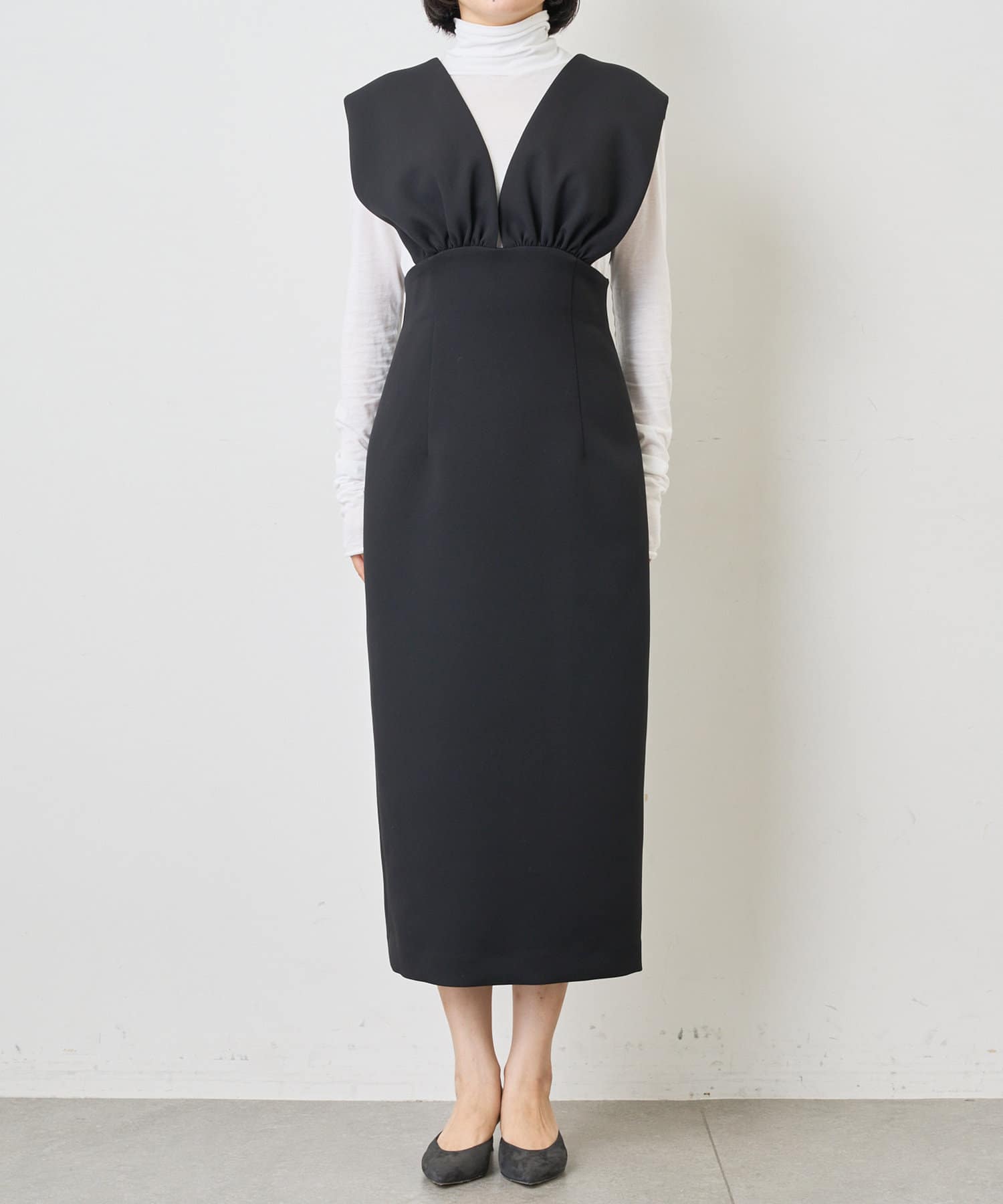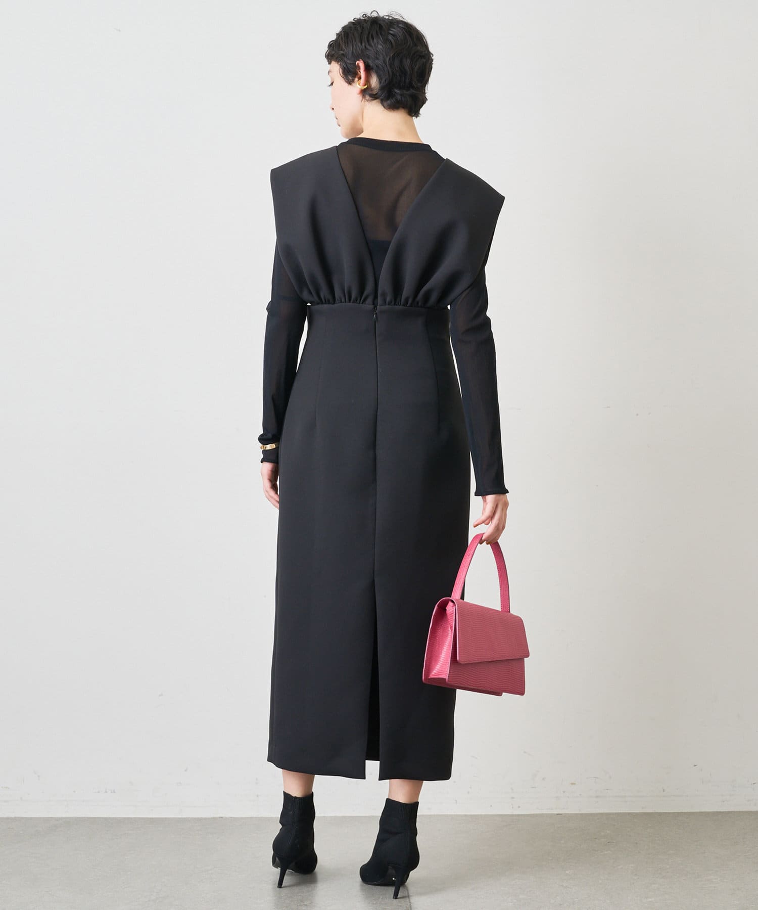 V形的開口增加了銳利的印象,而胸前的褶皺使其具有女性化的設計。