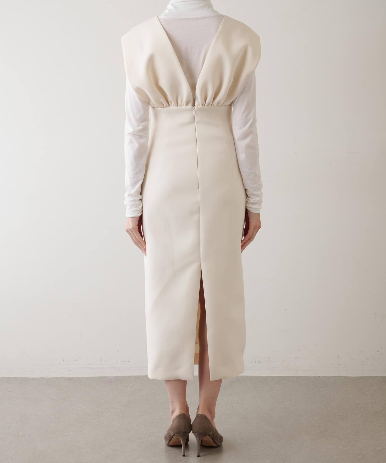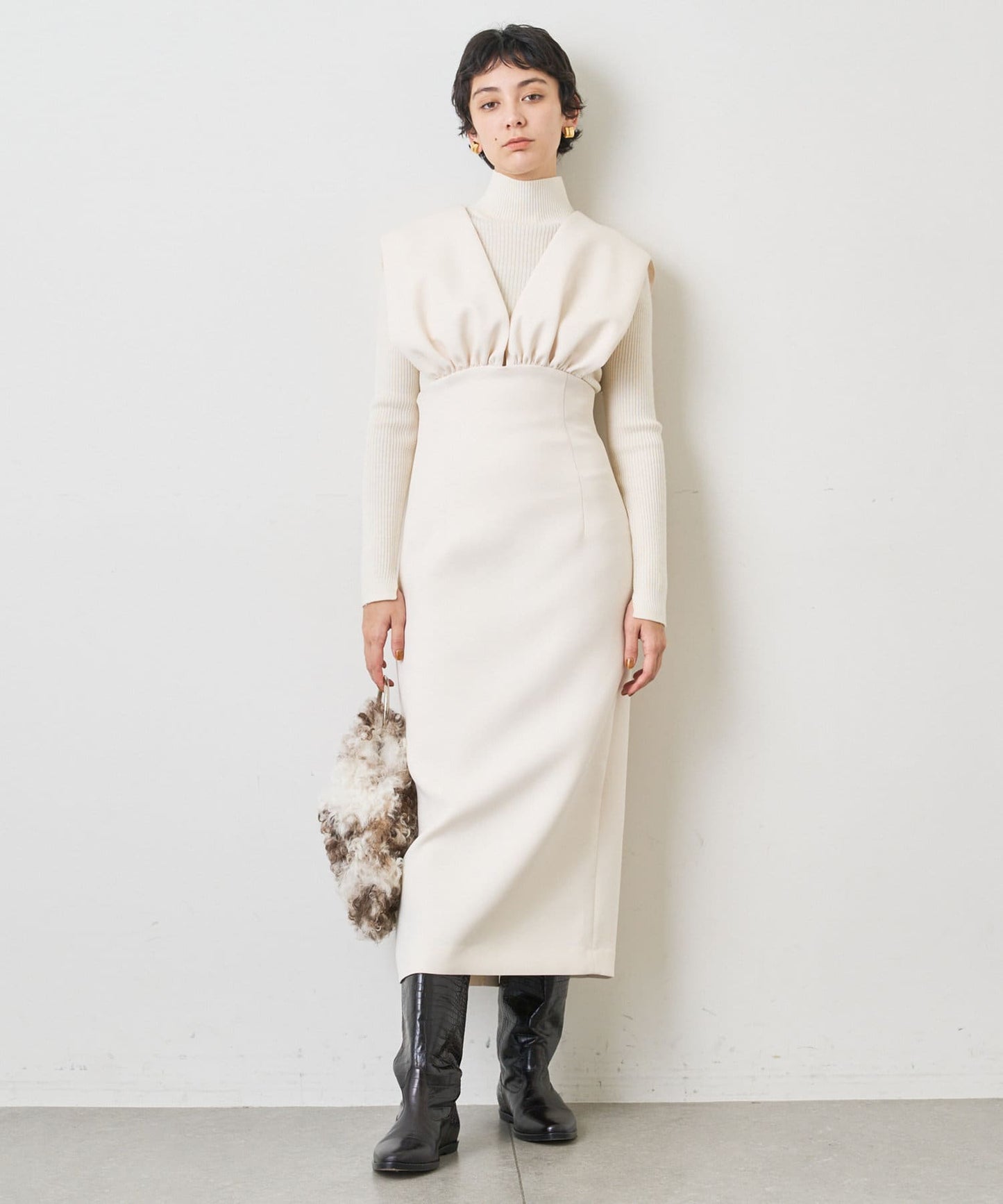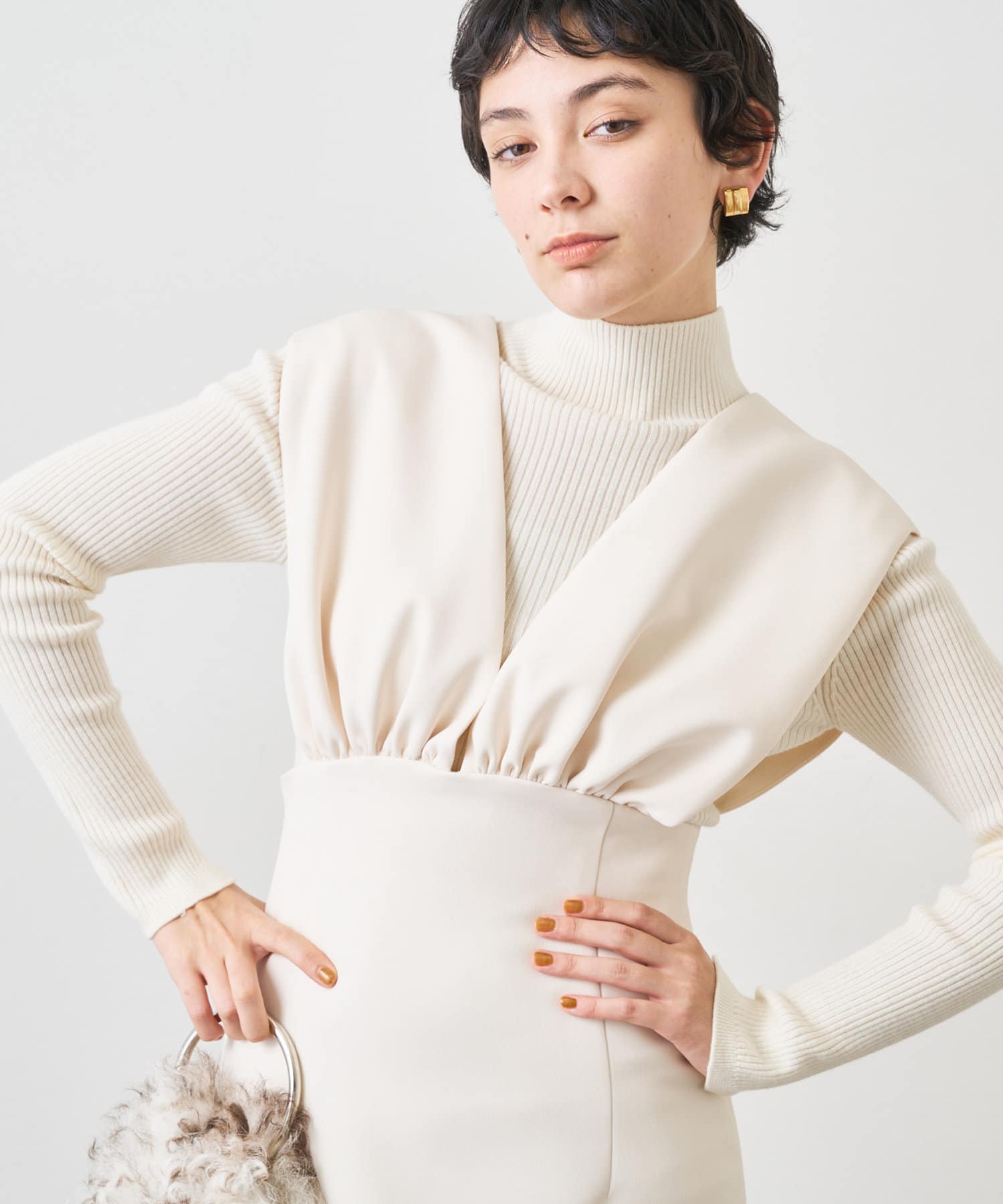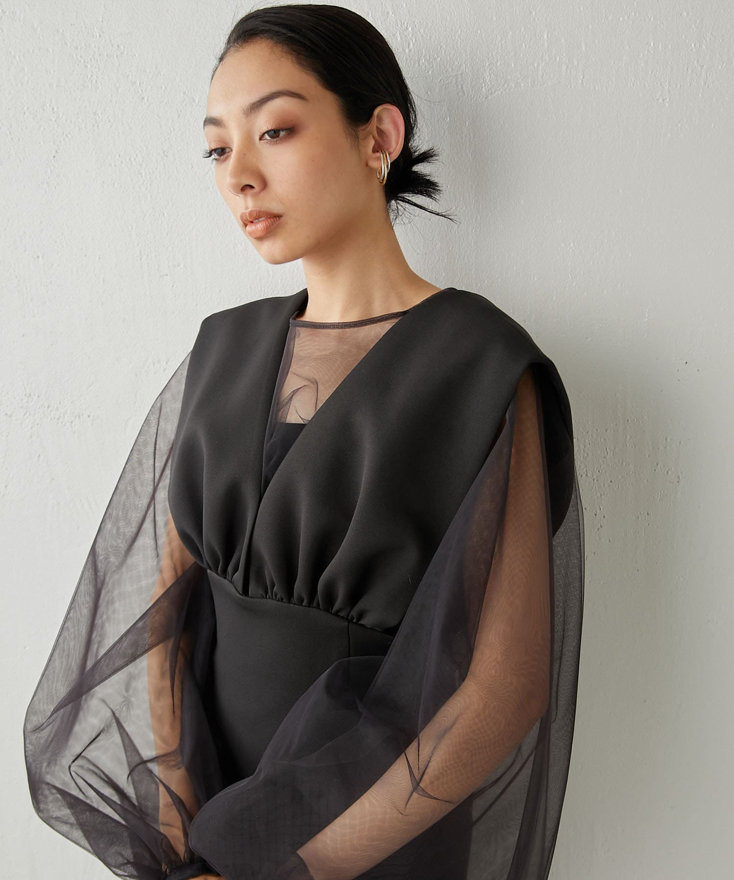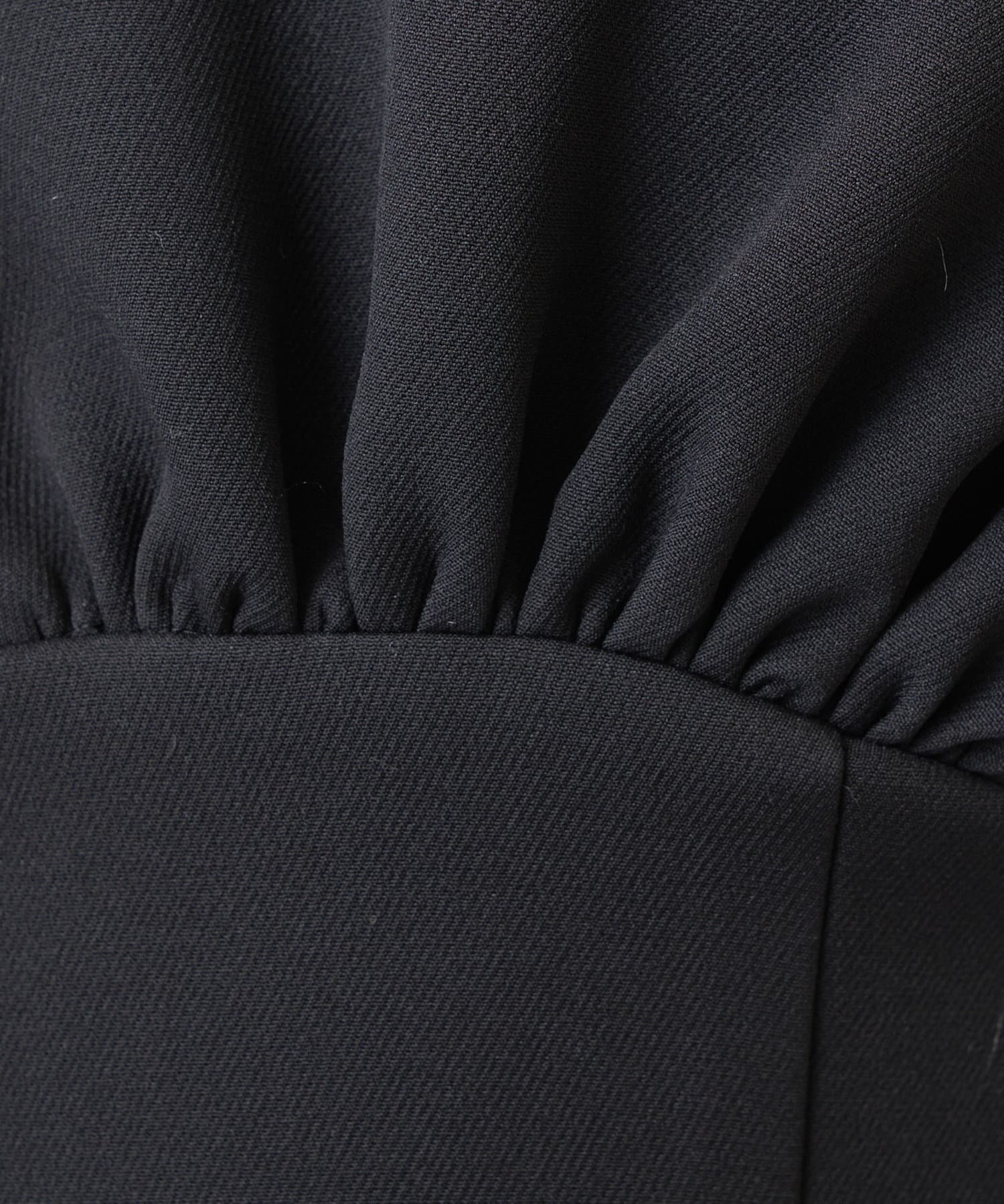 V形的開口增加了銳利的印象,而胸前的褶皺使其具有女性化的設計。
