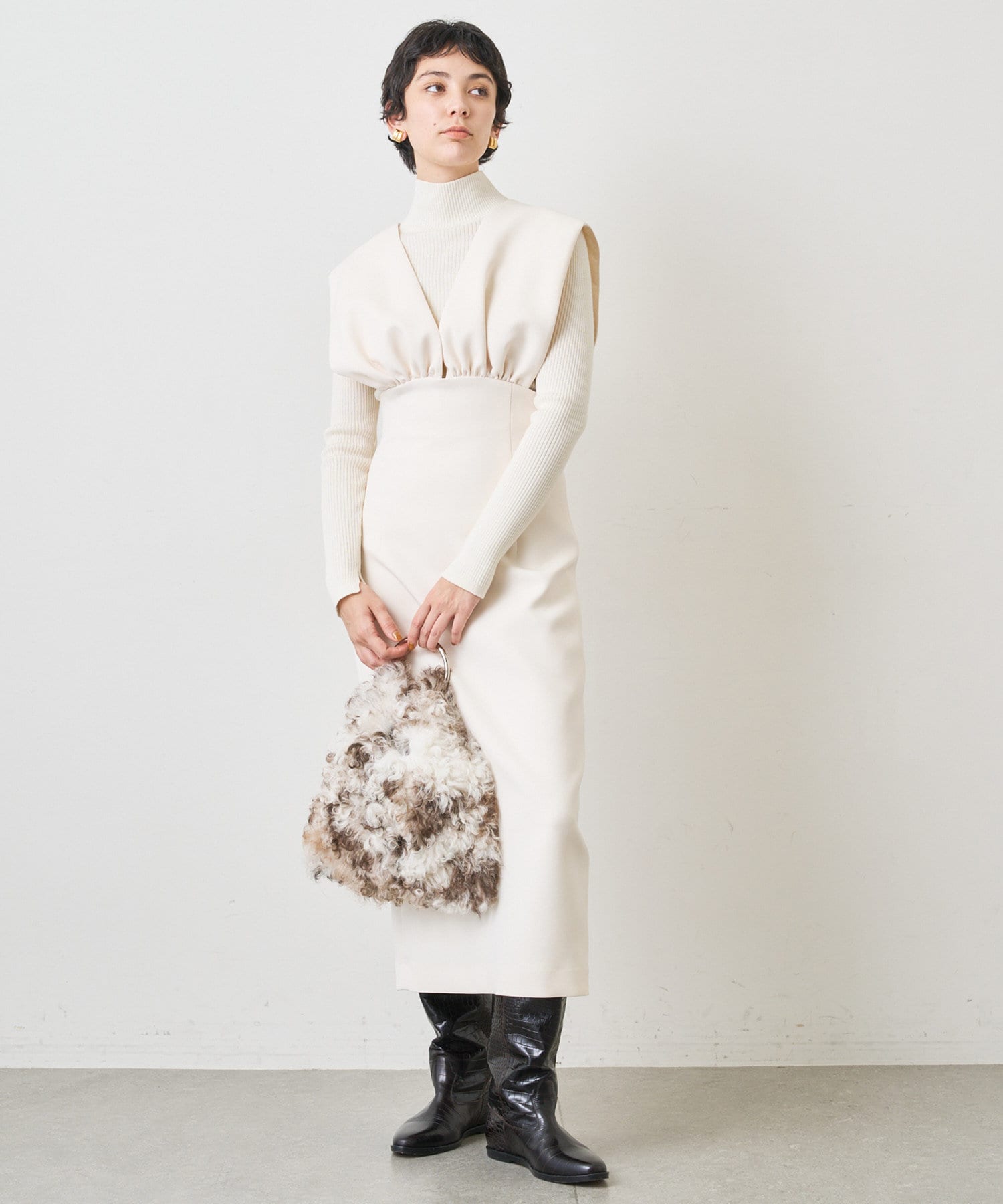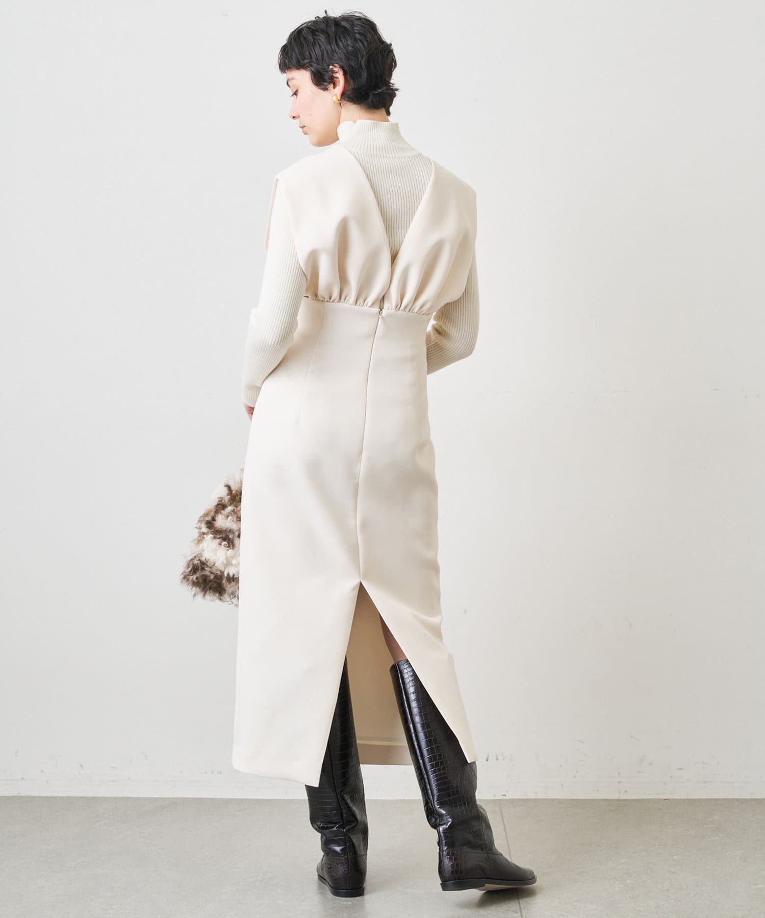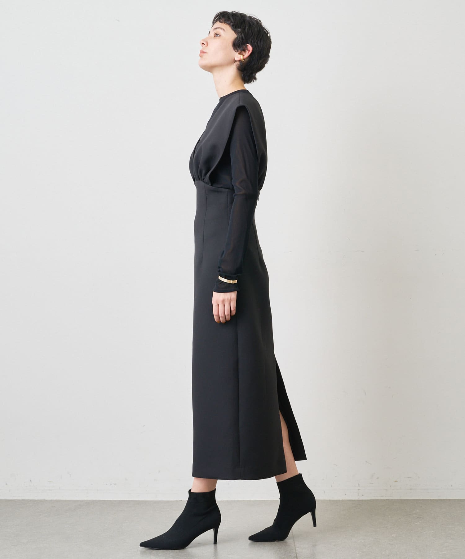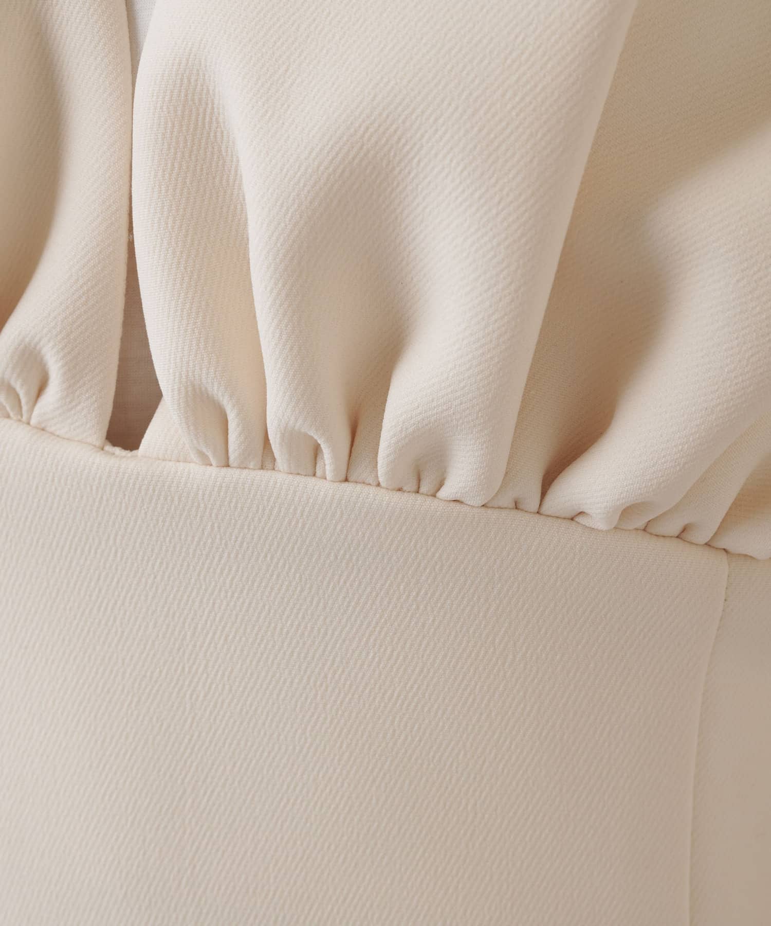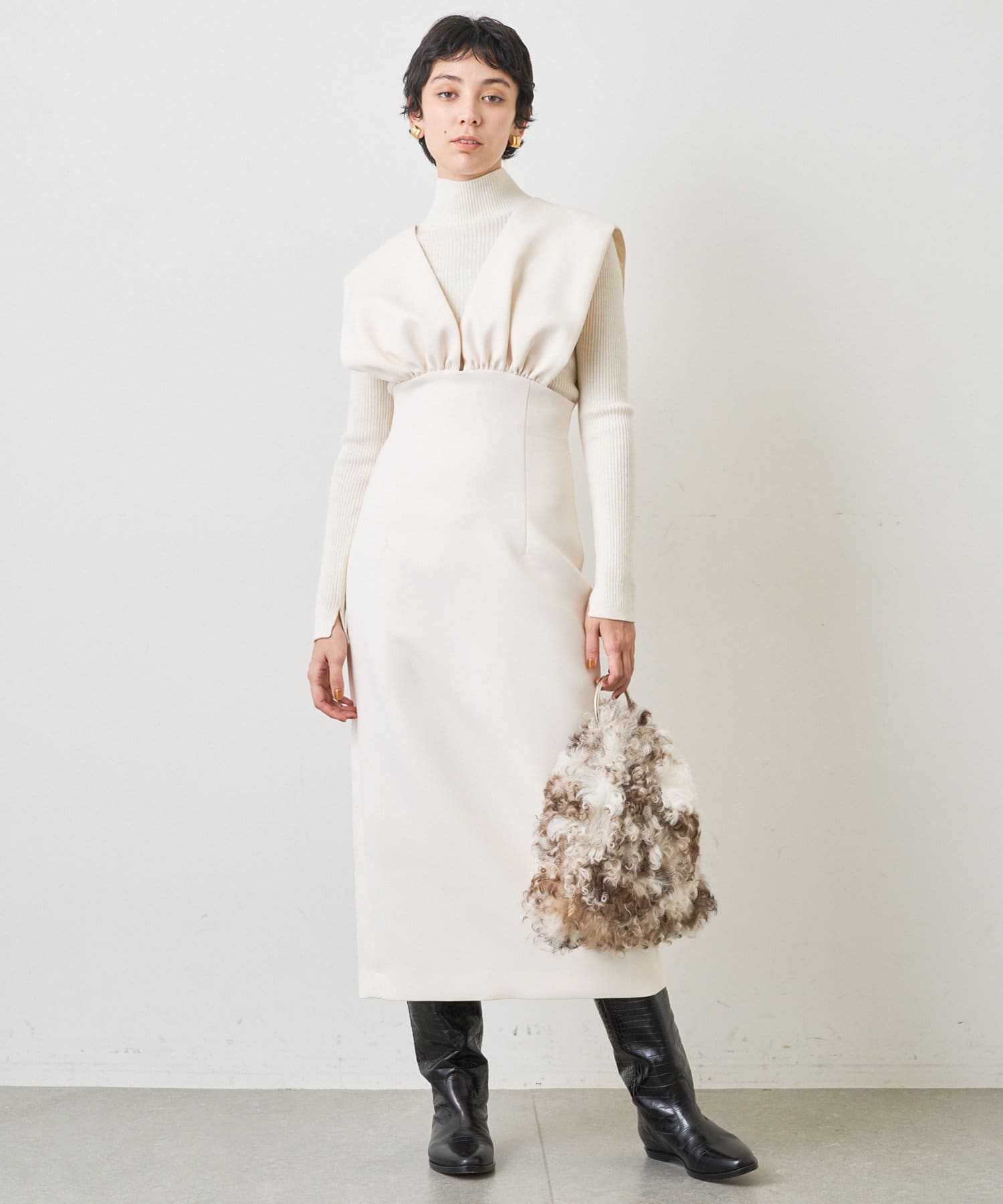 V形的開口增加了銳利的印象,而胸前的褶皺使其具有女性化的設計。