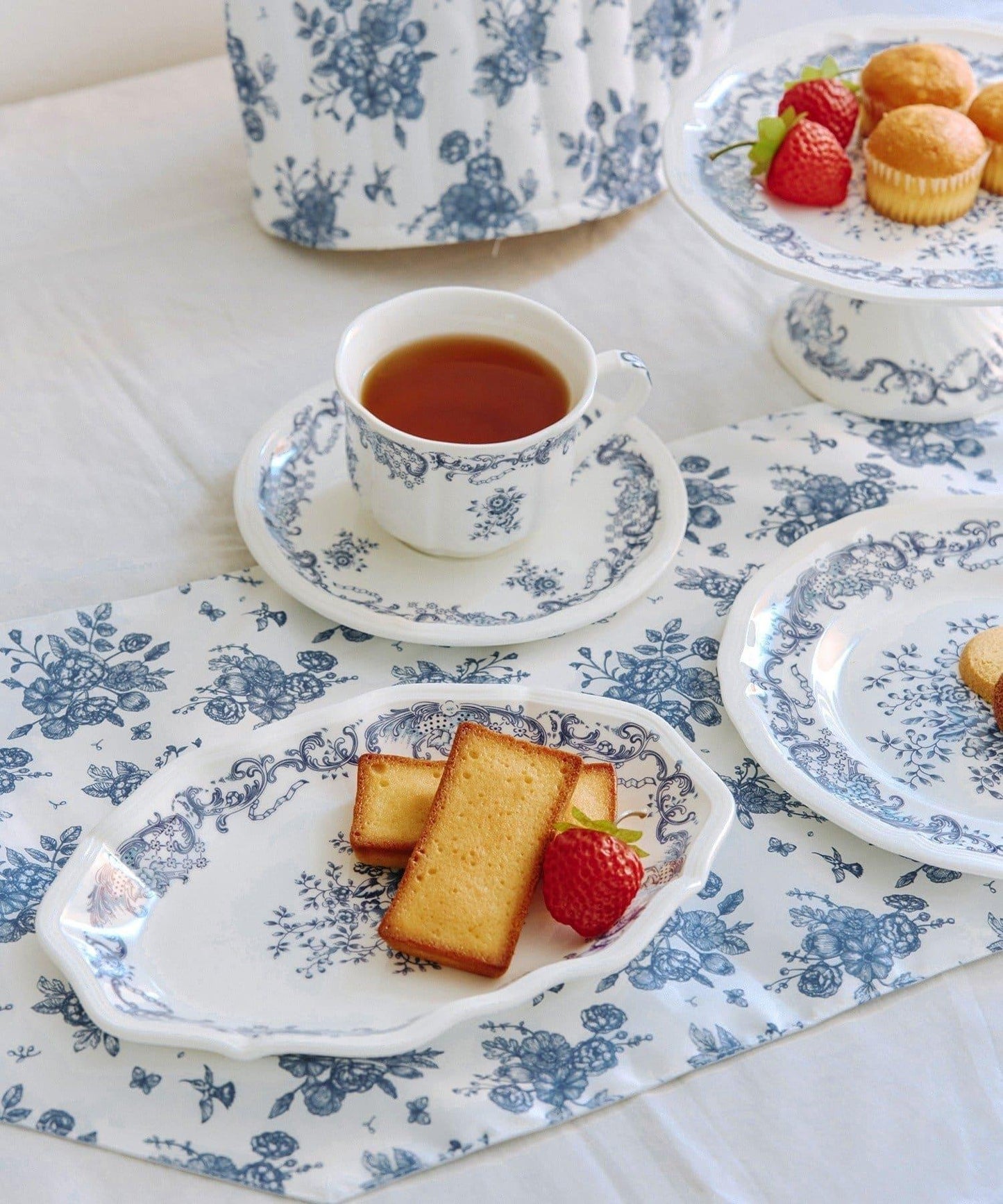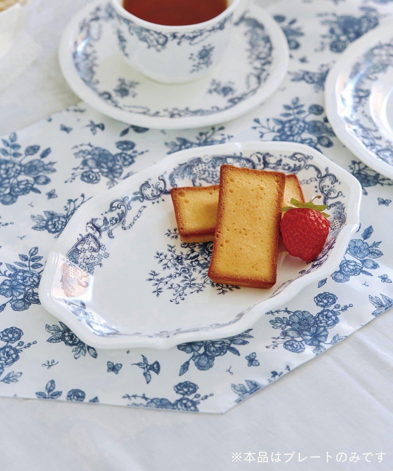 橢圓形盤子上有清新的藍色花朵圖案,為您的下午茶時光增添一抹亮色。