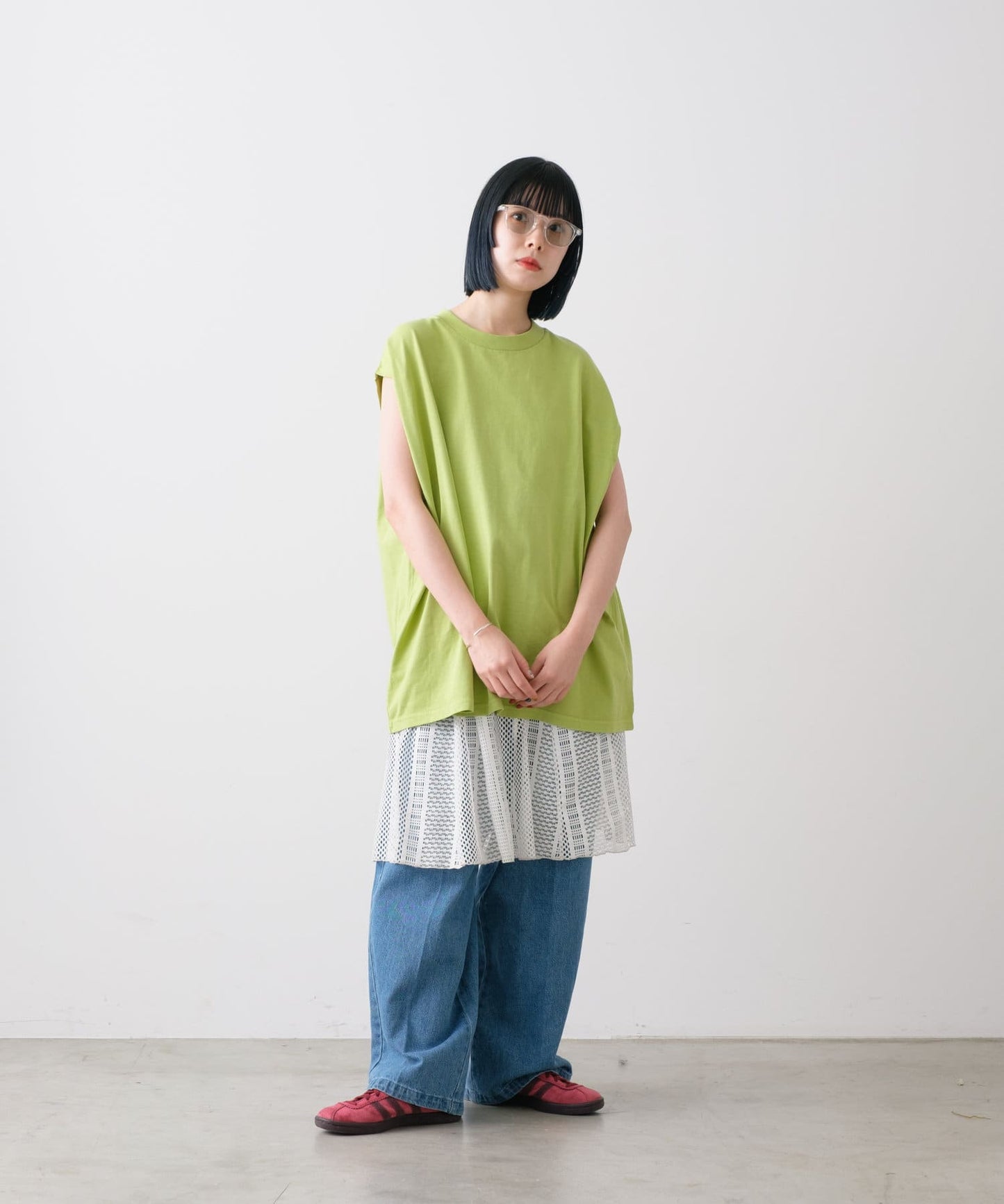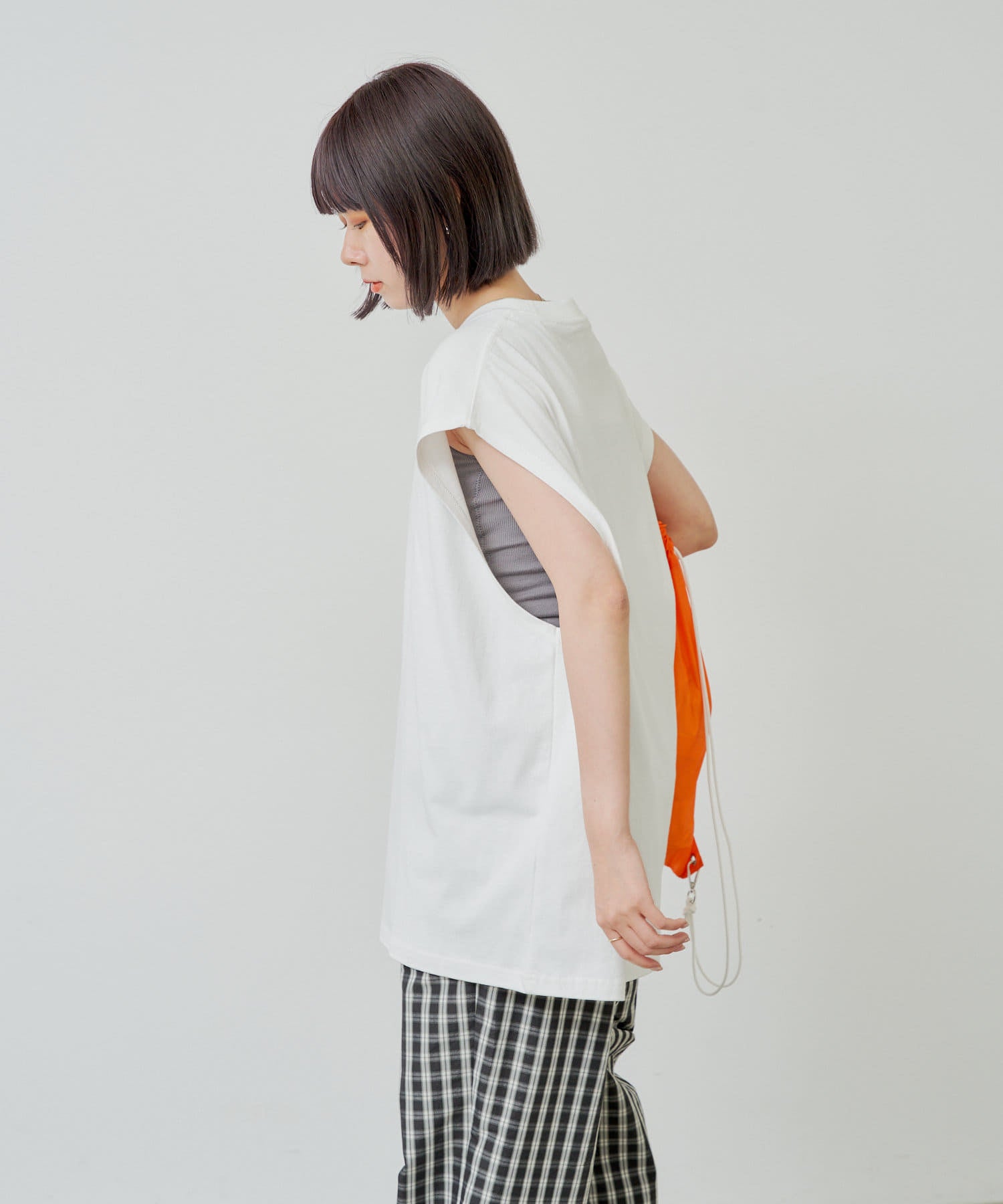 這款無袖 T 恤剪裁寬鬆,肩部傾斜度適中,衣身寬大。