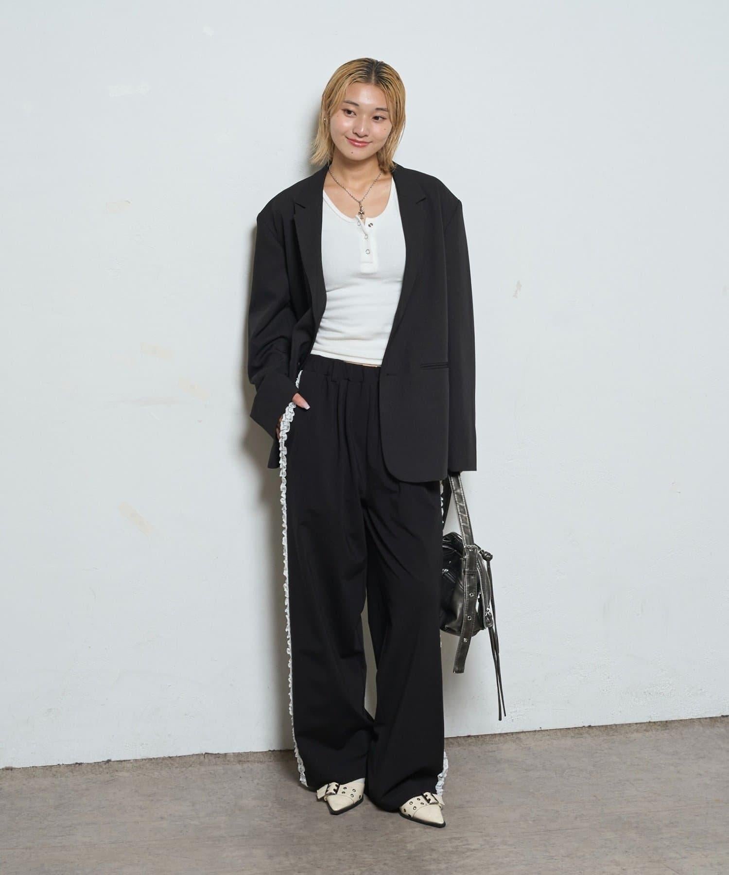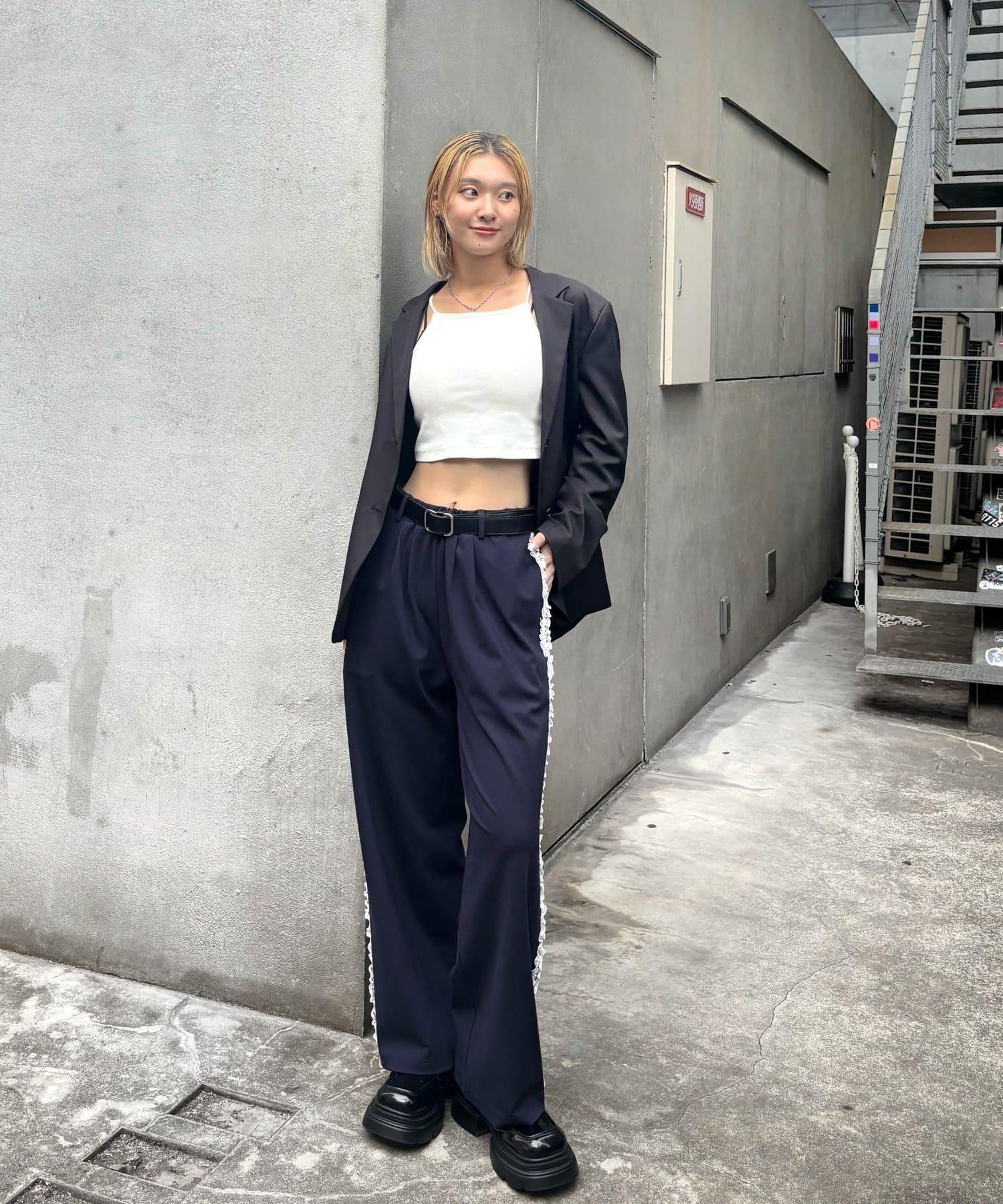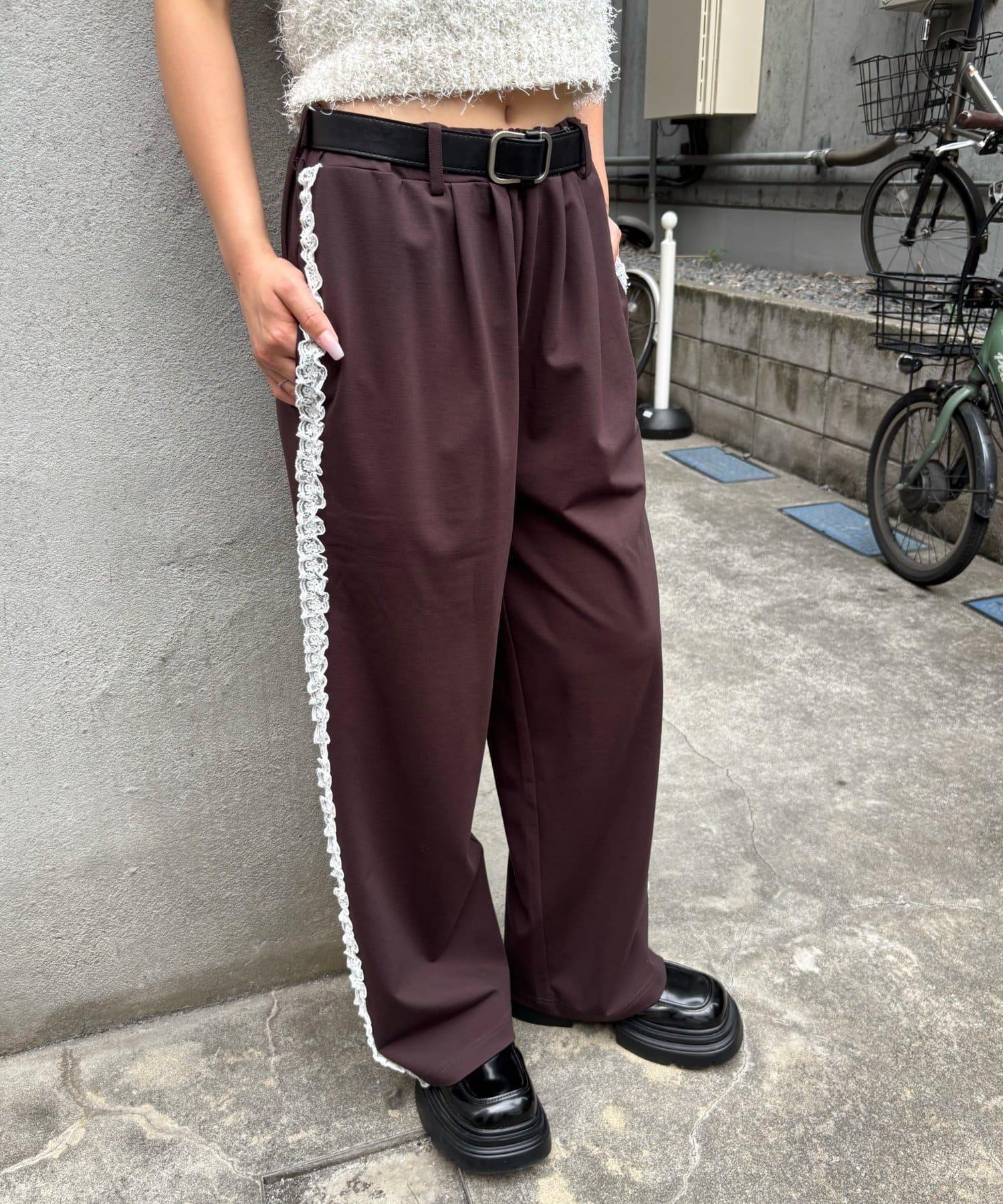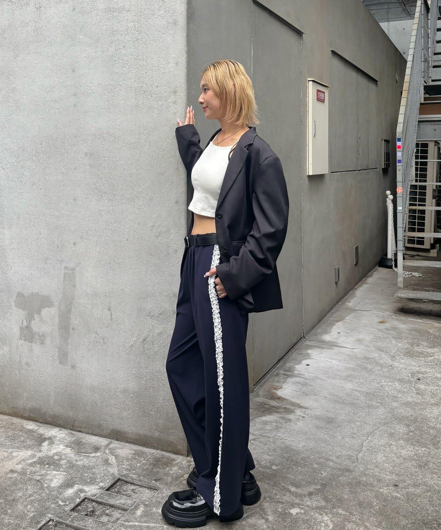長褲兩側精緻的蕾絲花邊增添了一種微妙的優雅氣質。