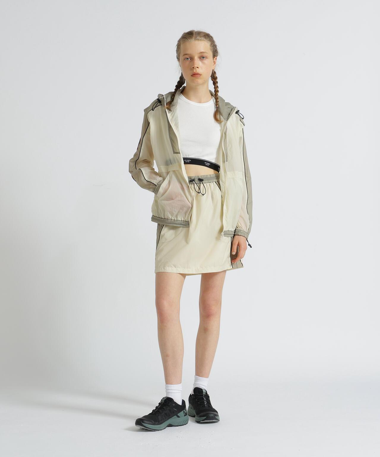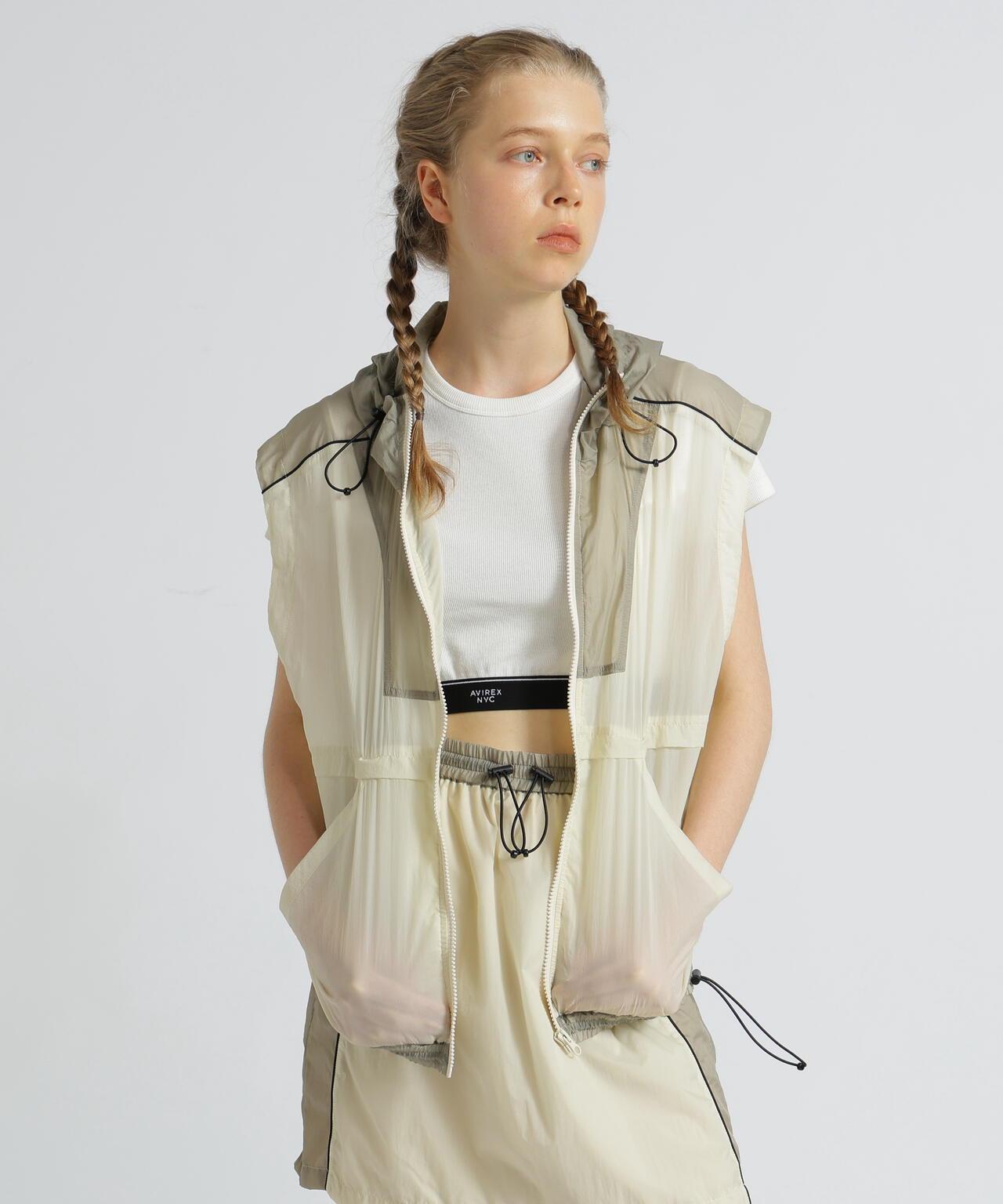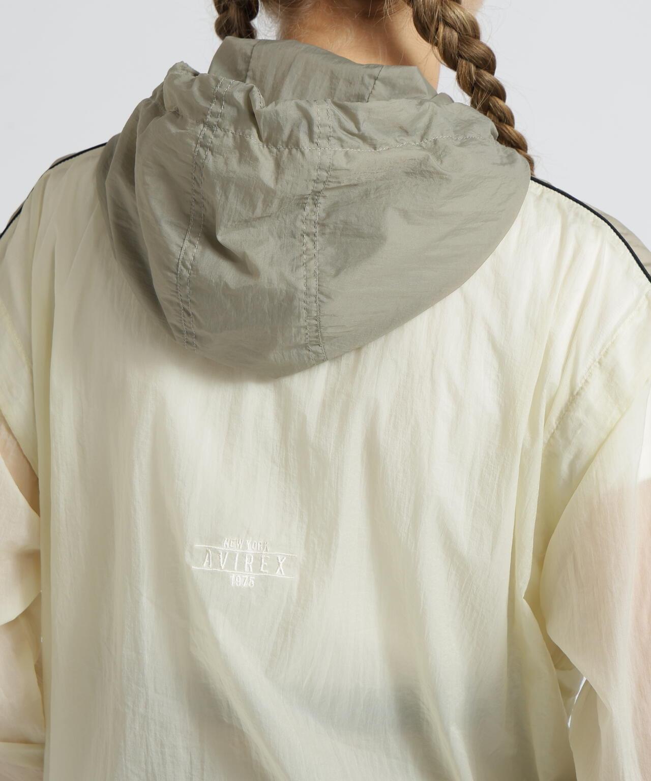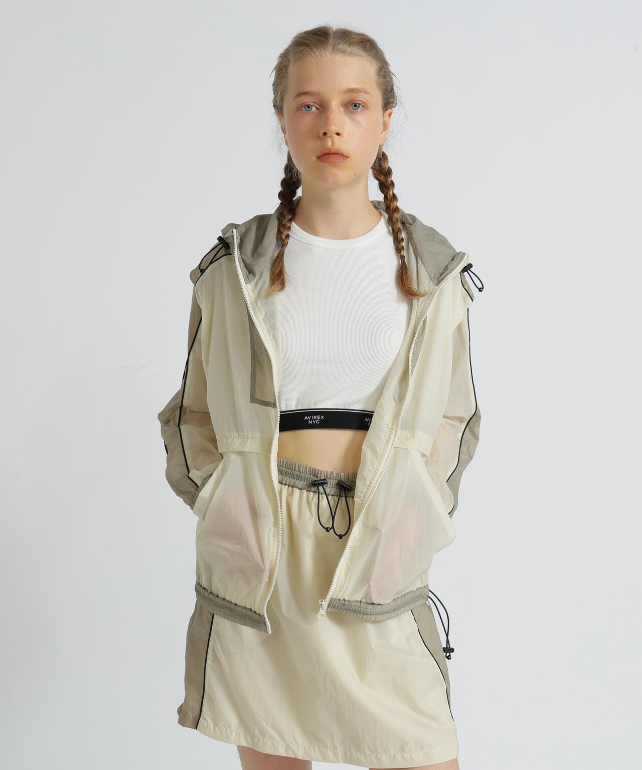 透明尼龍材料製成的透視外衣,袖子可拆卸,因此也可作為馬甲穿著。從夏季到初秋,該產品可長期穿著。AVIREX WOMAN] 該系列將純正軍裝的功能性和設計感投射到女式休閒裝上。作為一個獨特而永恆的女裝品牌,它為聰明、自由、好奇、端莊、活潑的成年職業女性提供女式休閒裝。