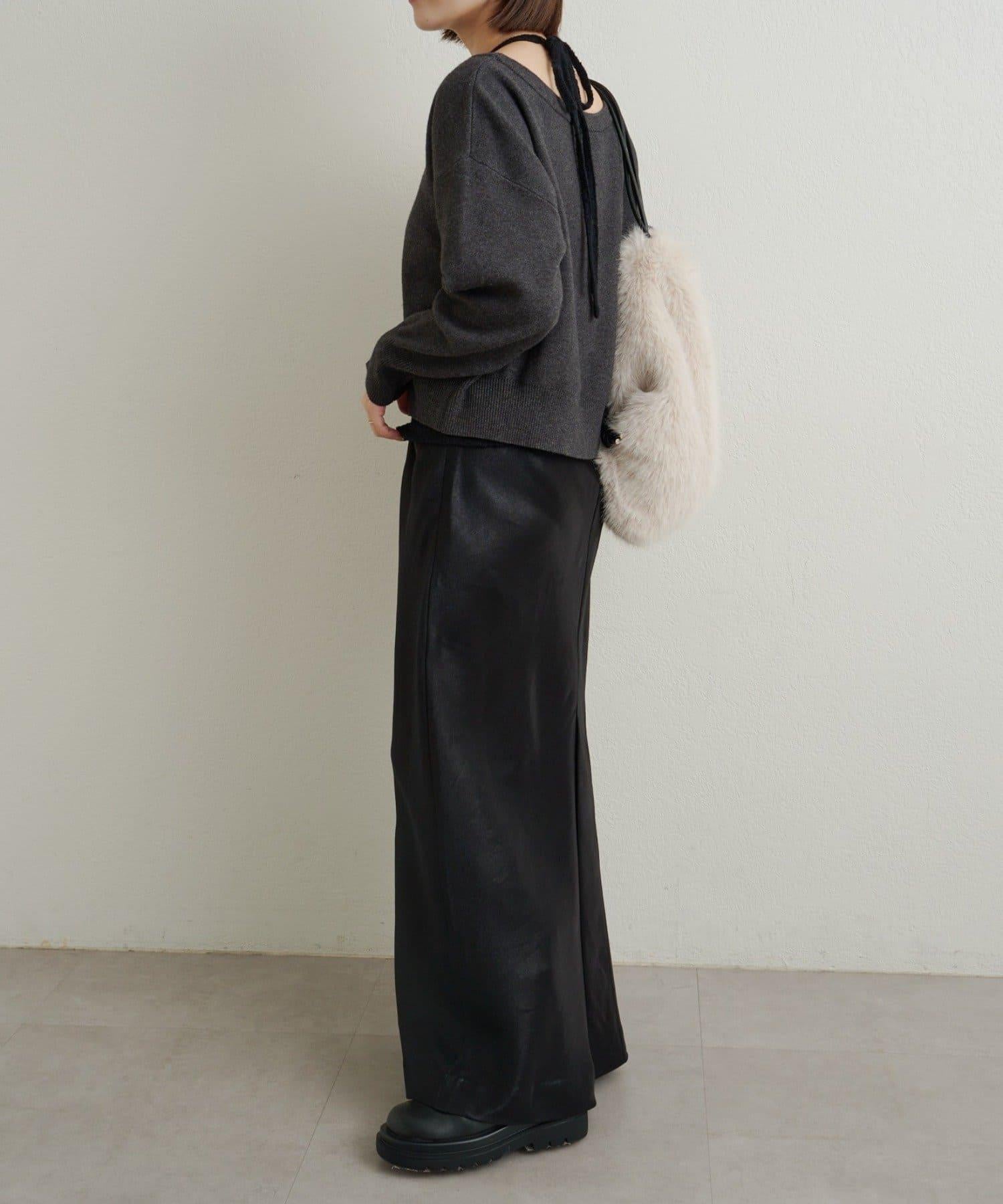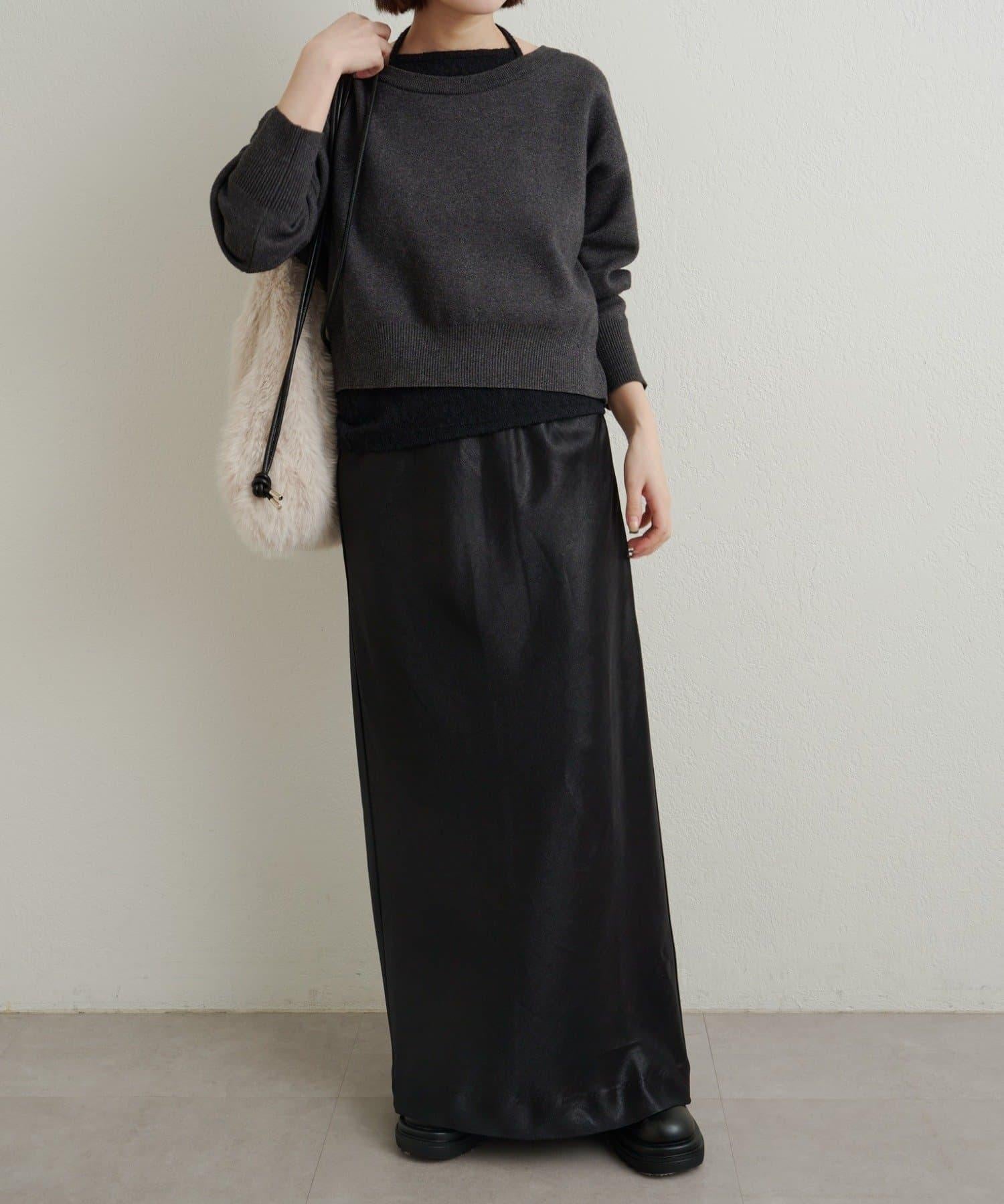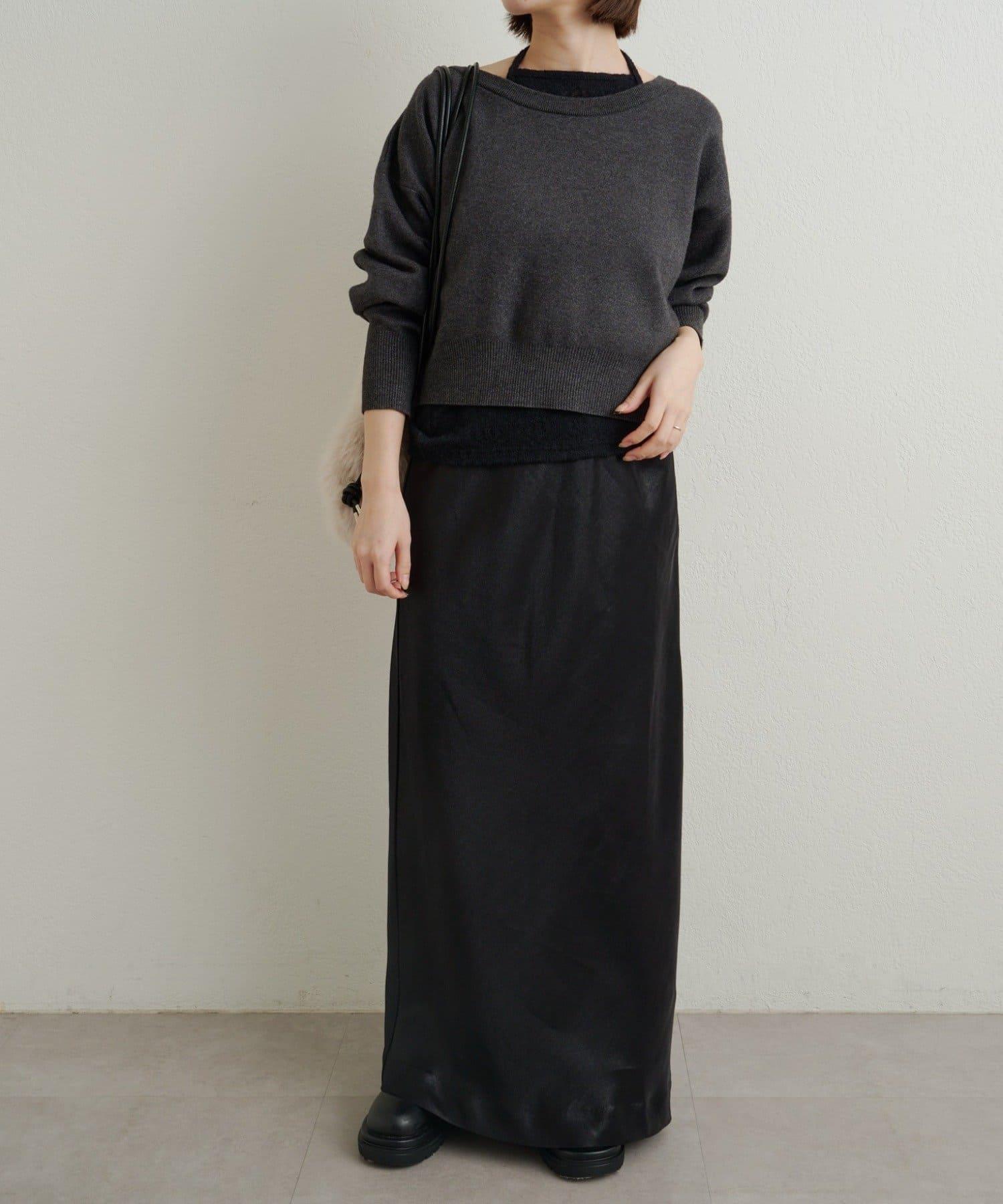 這款半身裙的頸部開口較寬,因此也可作為單肩套裝穿著。